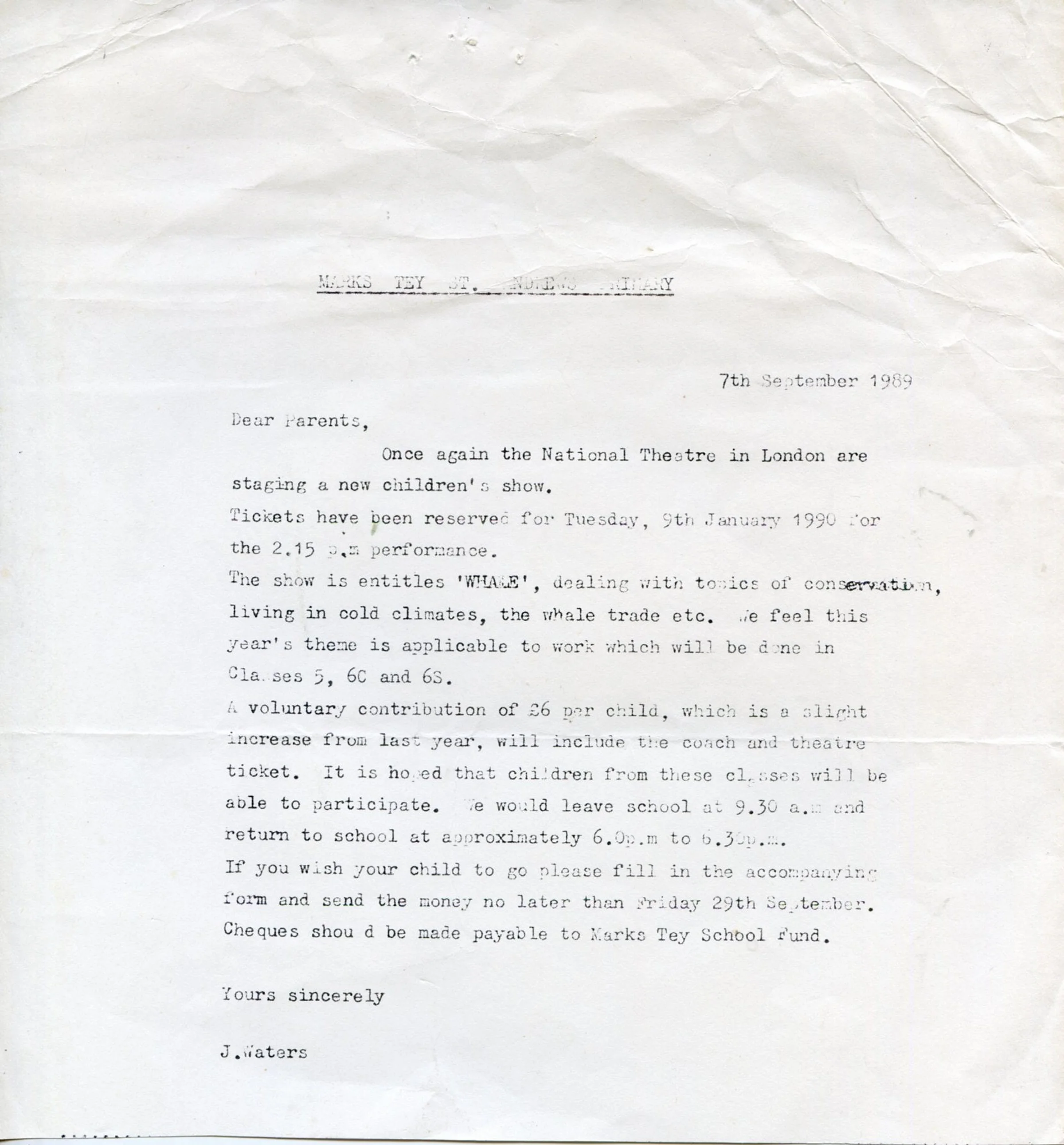 The letter to the parents from St Andrews Primary School dates back to 7th September 1989, informing the parents of a visit to the National Theater on 9th January 1990.