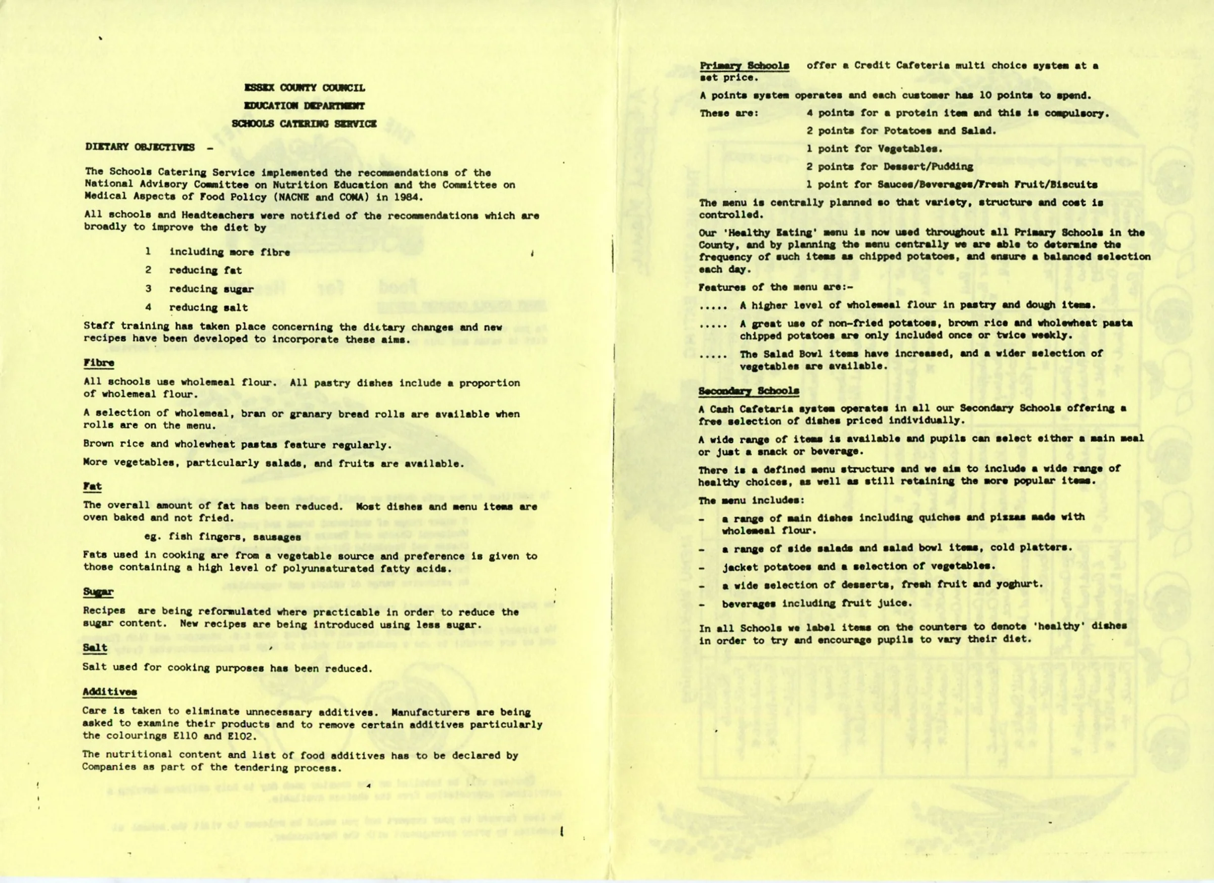 A newsletter to the parents by the school catering services regarding the dietary objectives and standard healthy diet.