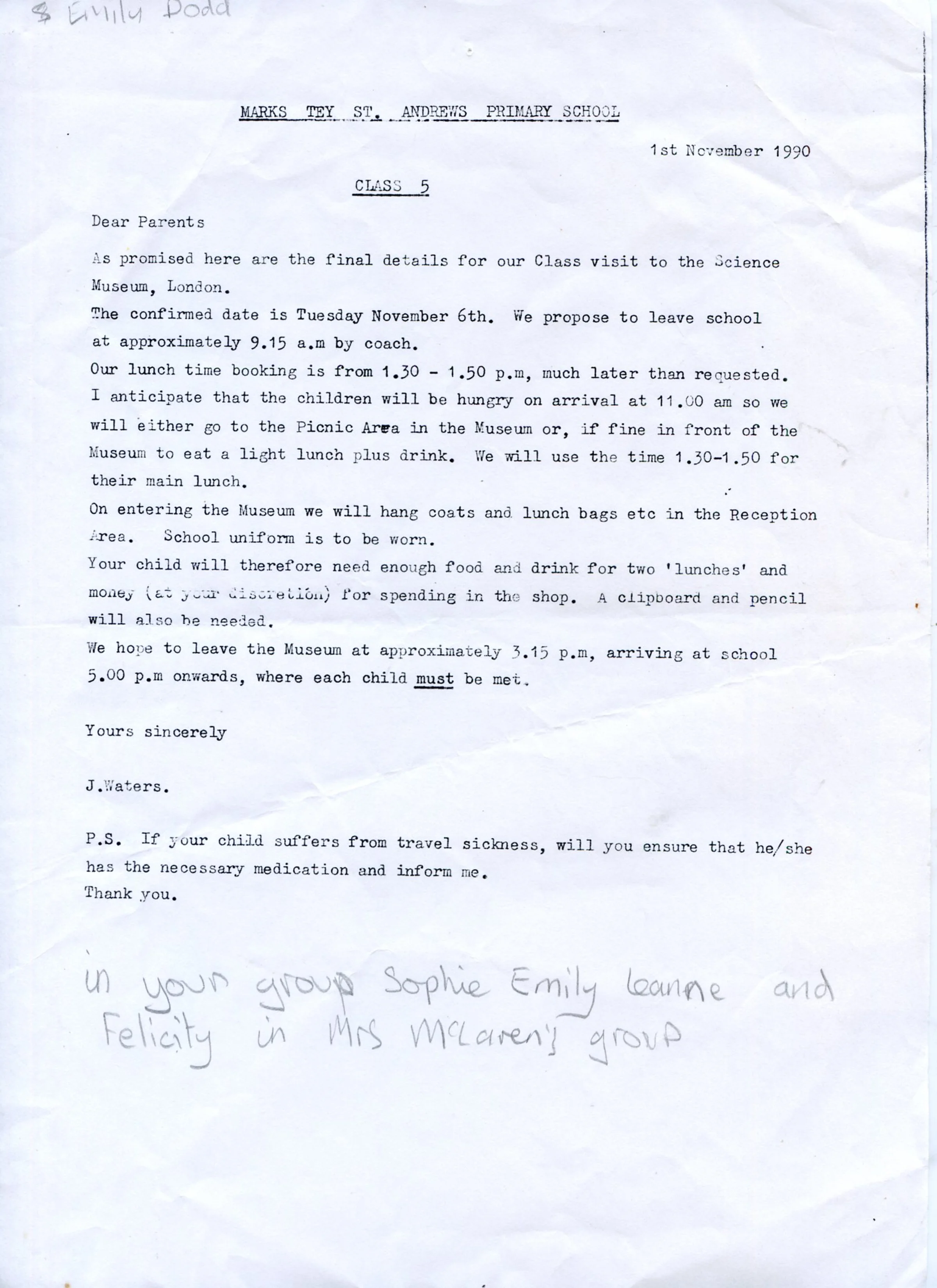 Letter sent to the parents by the school authorities regarding a school visit to the Science Museum.