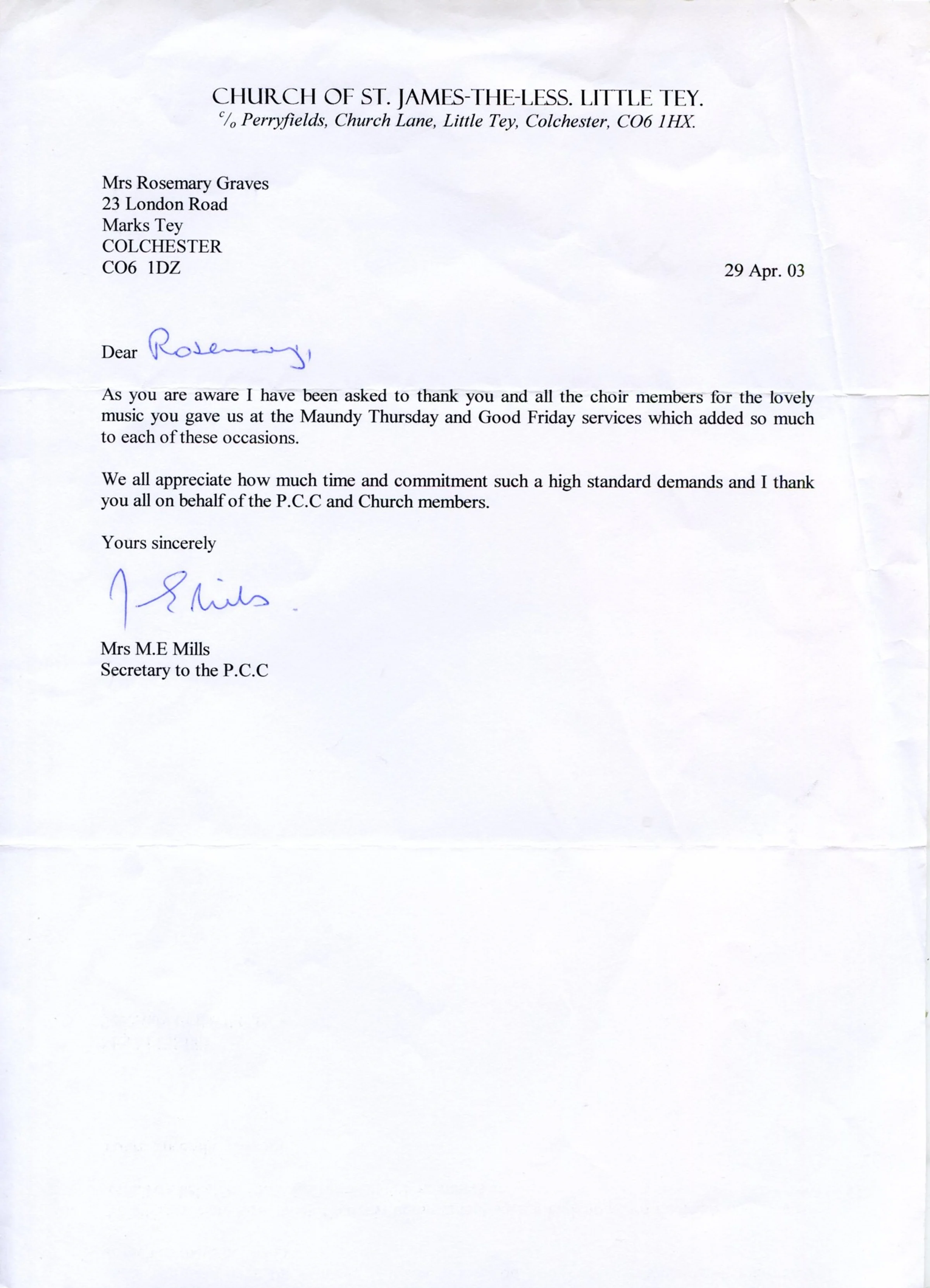 A letter of thanks sent to Rosemary Graves by Mrs M E Mills, PCC Secretary of Little Tey, for all the lovely contributions by The Tey Singers on Maundy Thursday and Good Friday etc