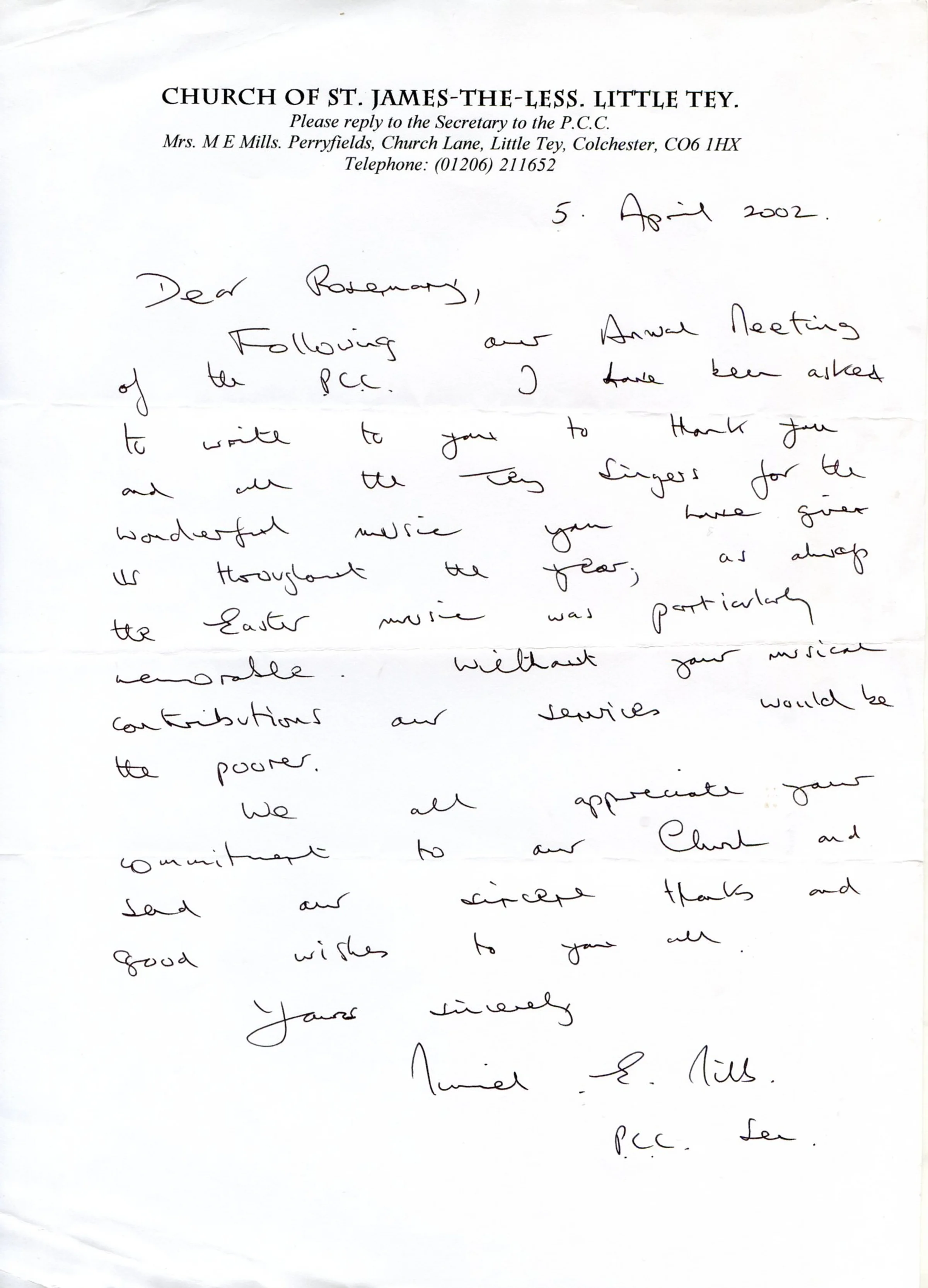 Following our Annual Meeting of our P.C.C. I have been asked to write to you to thank you and the Tey Singers for the wonderful music you have given us throughout the year, as always the Easter music was particularly memorable. Without your contributions our services would be the poorer.