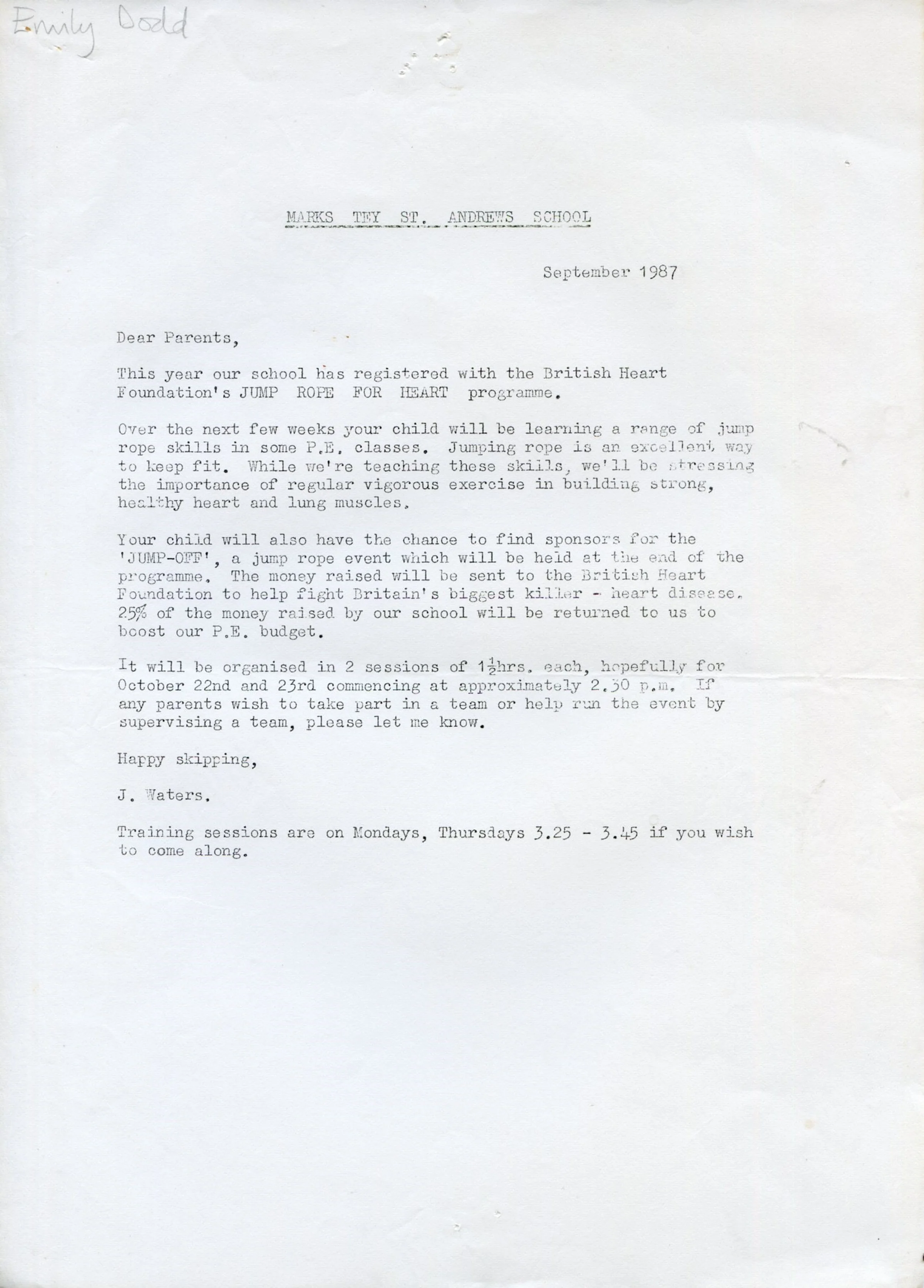 The letter is for parents about the jump rope for heart programme as a part of their registration with British Heart Foundation