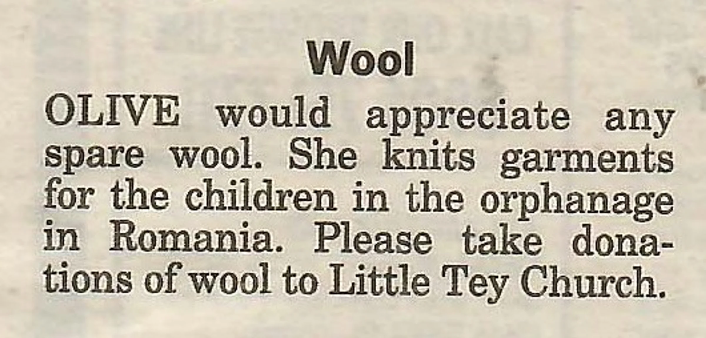Village newspaper column reporting on knitting for Romania by Olive Otter.