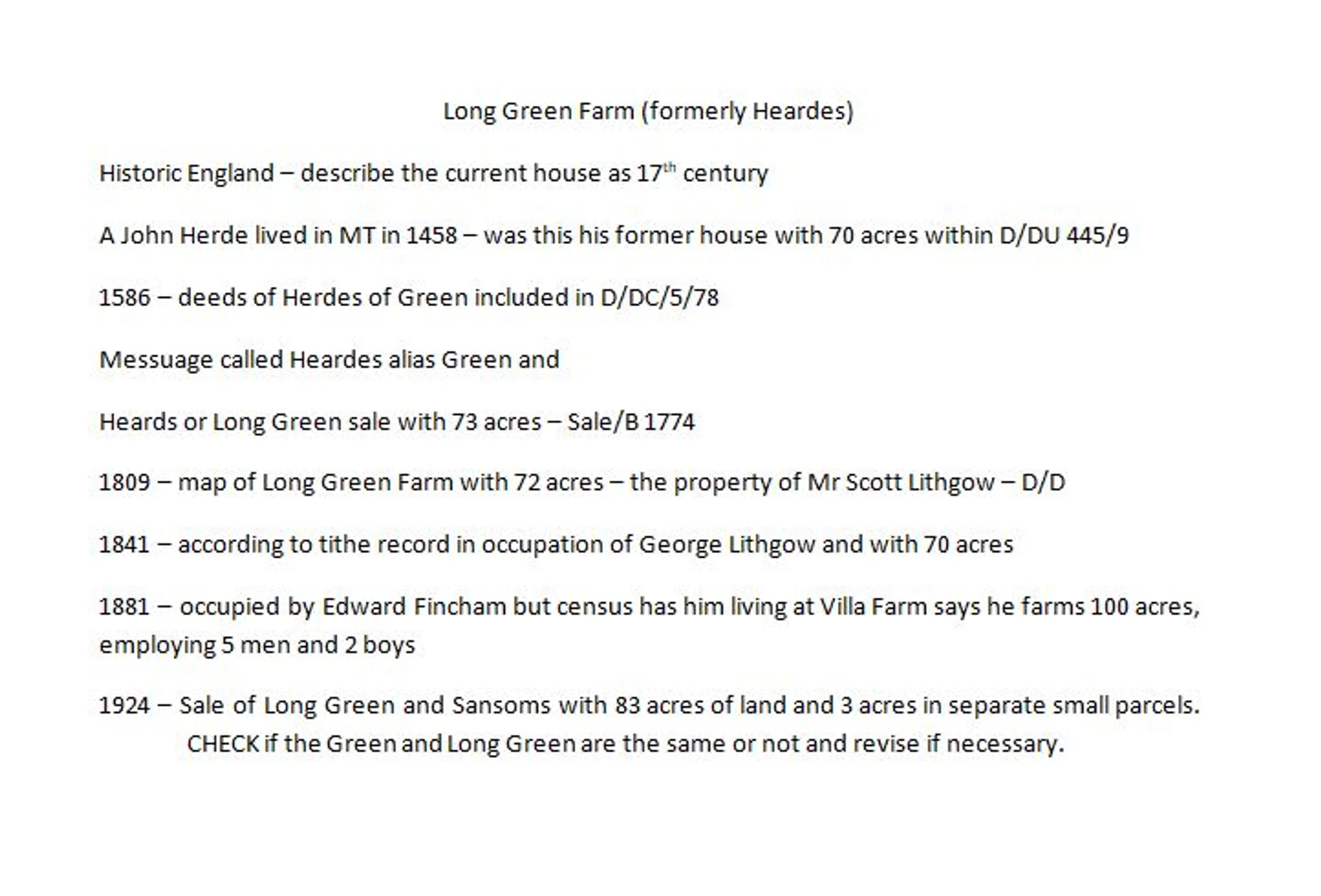 The history of the farm at Long Green. It was sold in 1913 along with Sansoms Cottage. It was also called Heards or Herdes, maybe after a John Herde who lived in Marks Tey in 1458.
