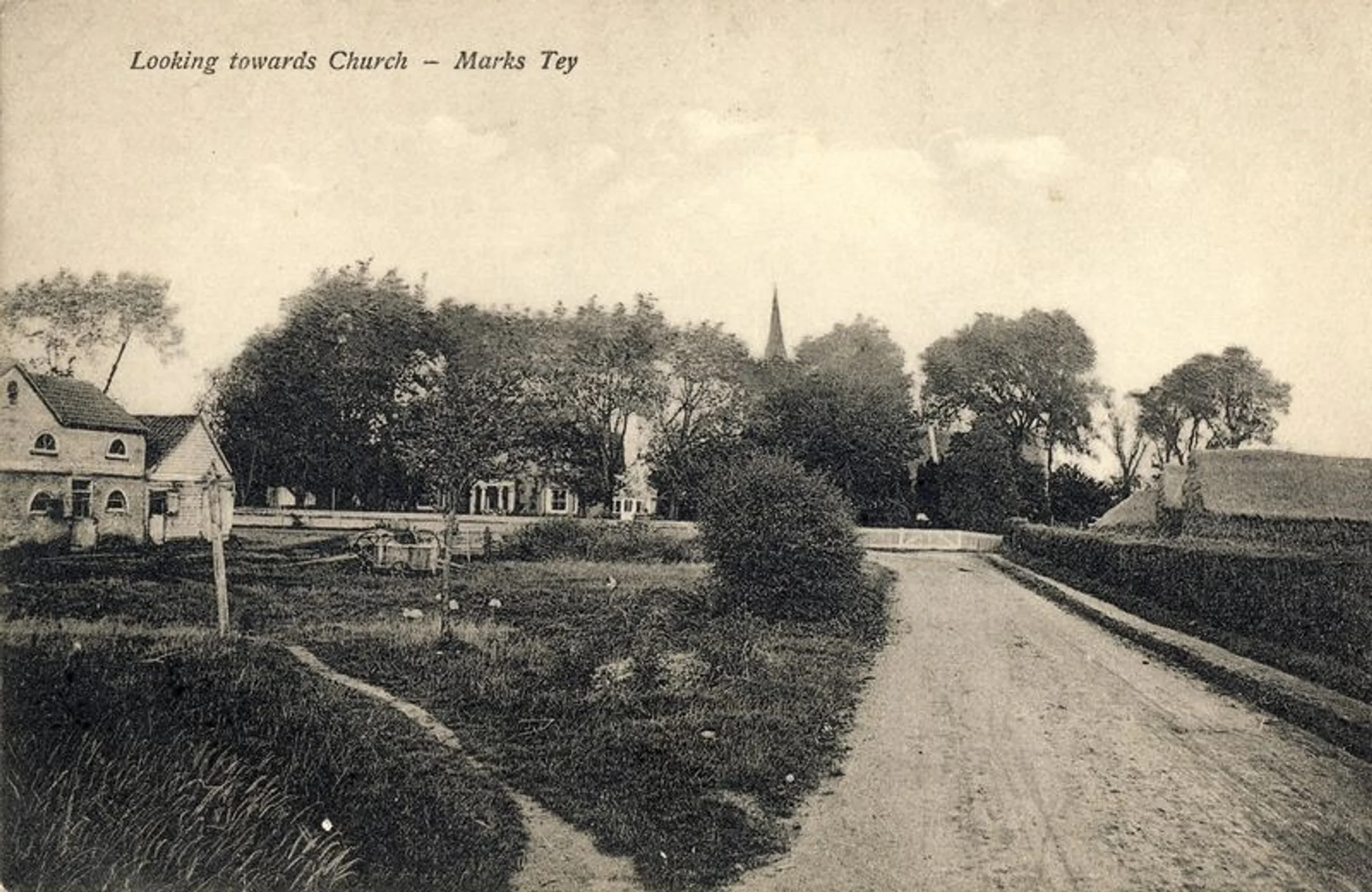 A postcard showing the view down Church Lane. Church Farm is on the left and the spire of St Andrew's church is visible in the distance.
