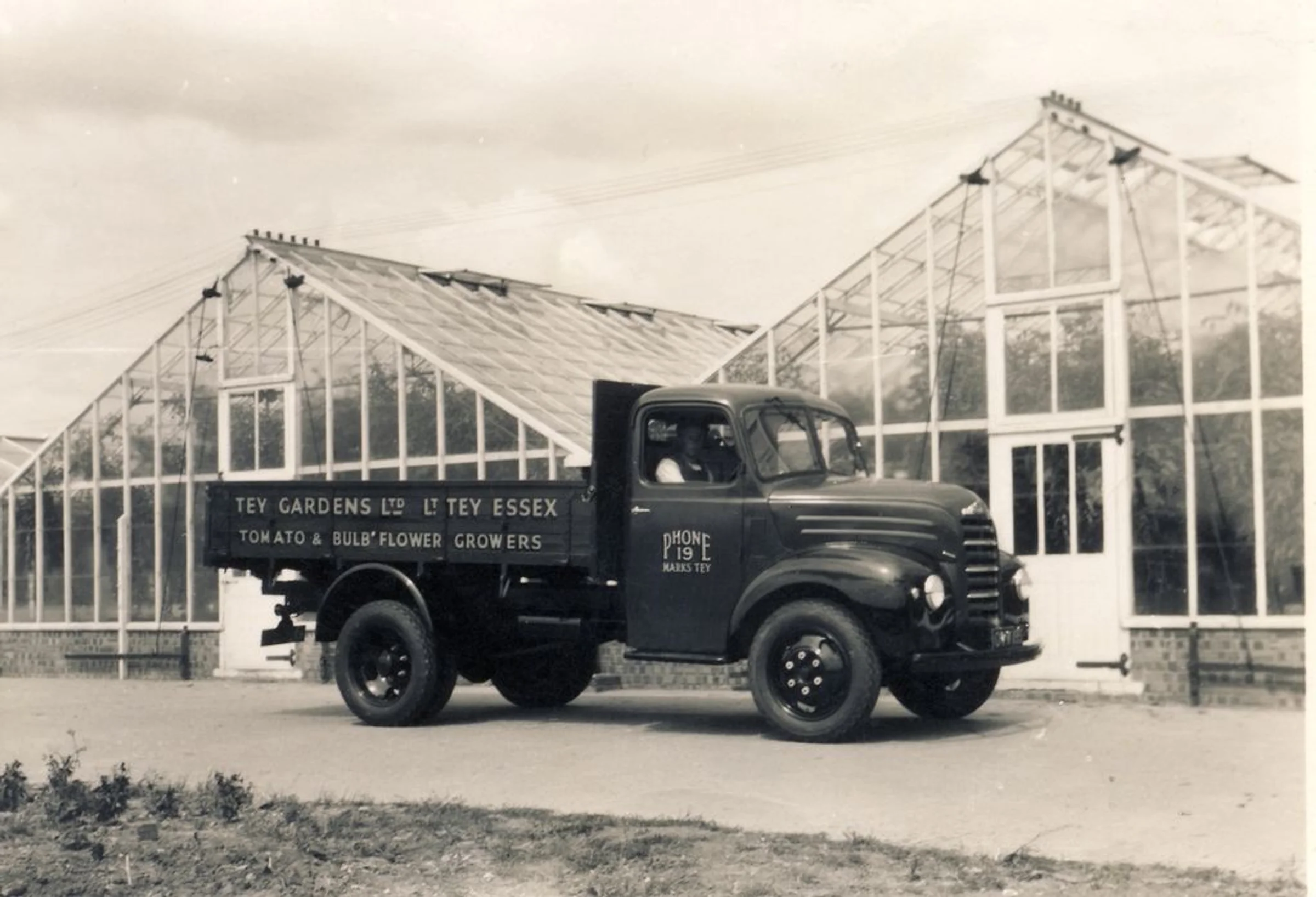 A lorry standing outside greenhouses at Tey Gardens. The wording on the lorry says TEY GARDENS LTD, LT TEY ESSEX, TOMATO & BULB FLOWER GROWERS, PHONE 19 MARKS TEY.