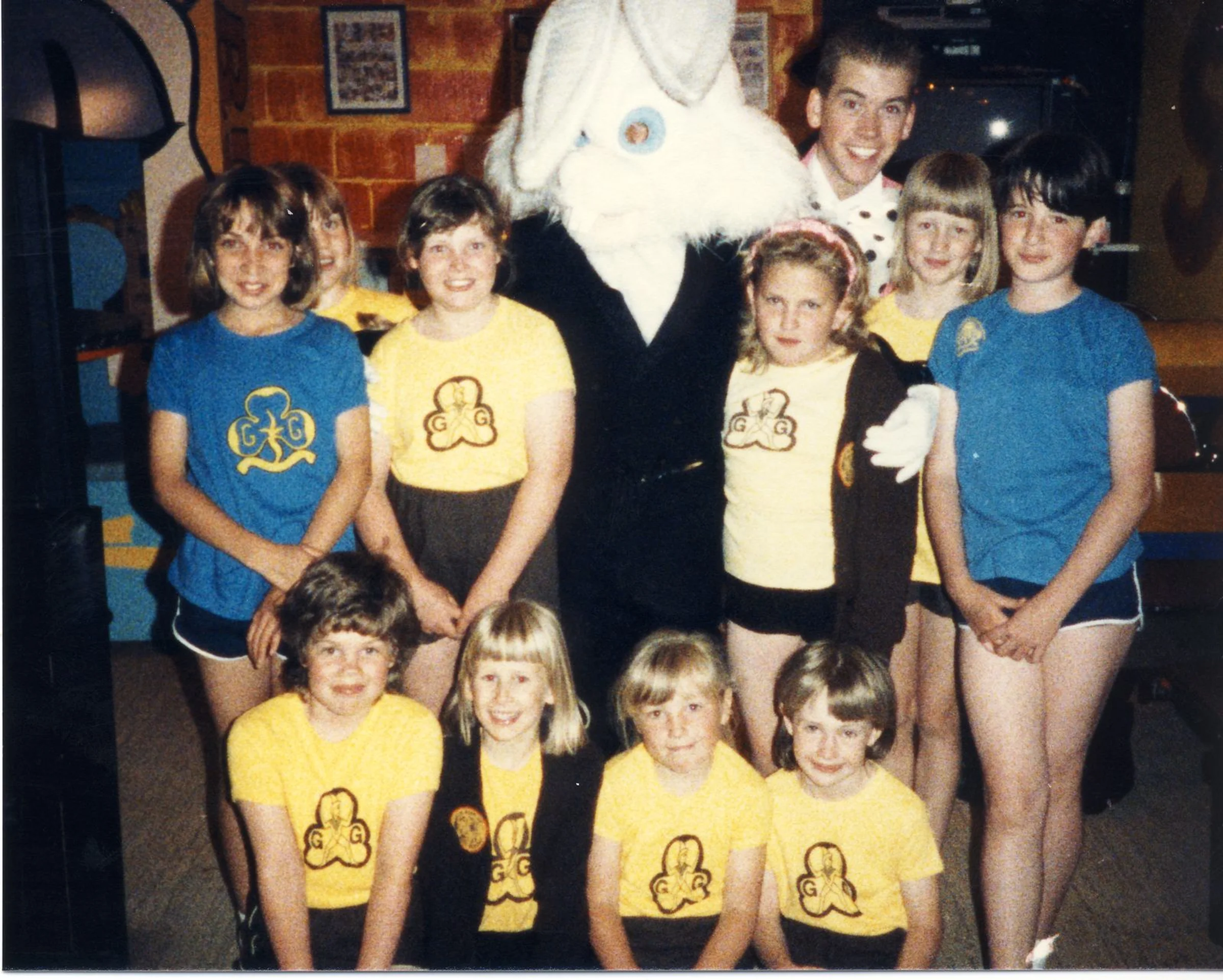 A group of Brownies away on a pack holiday or camp. There are ten girls, a young man and a giant white rabbit!