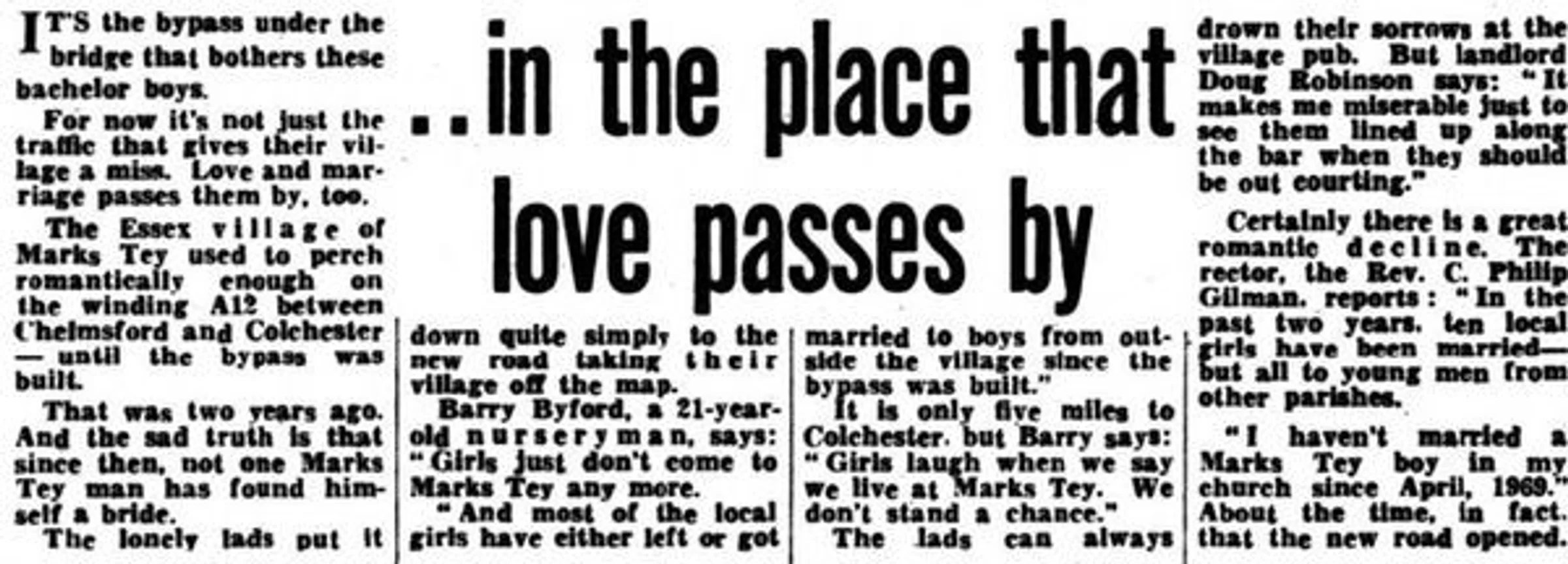 Young men in Marks Tey have not been able to find brides. The local girls are getting married the grooms from other place. The new A12 bypass opened in 1969 is being blamed.