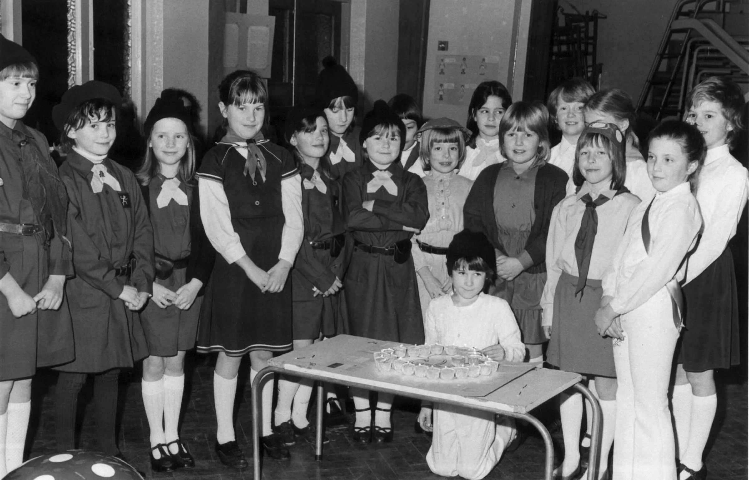 A group of girls, some in Brownie uniform and some not. There is a low table that appears to have a circular cake on it.