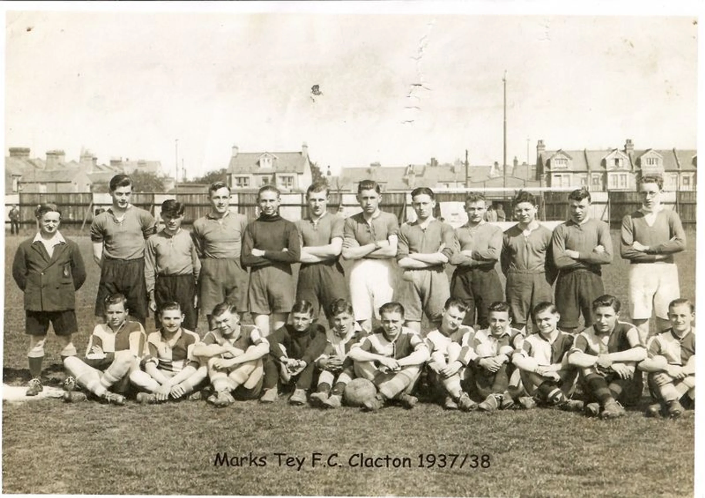 The Marks Tey football team photographed in Clacton in the 1937/38 season. The other men must belong to the Clacton team.