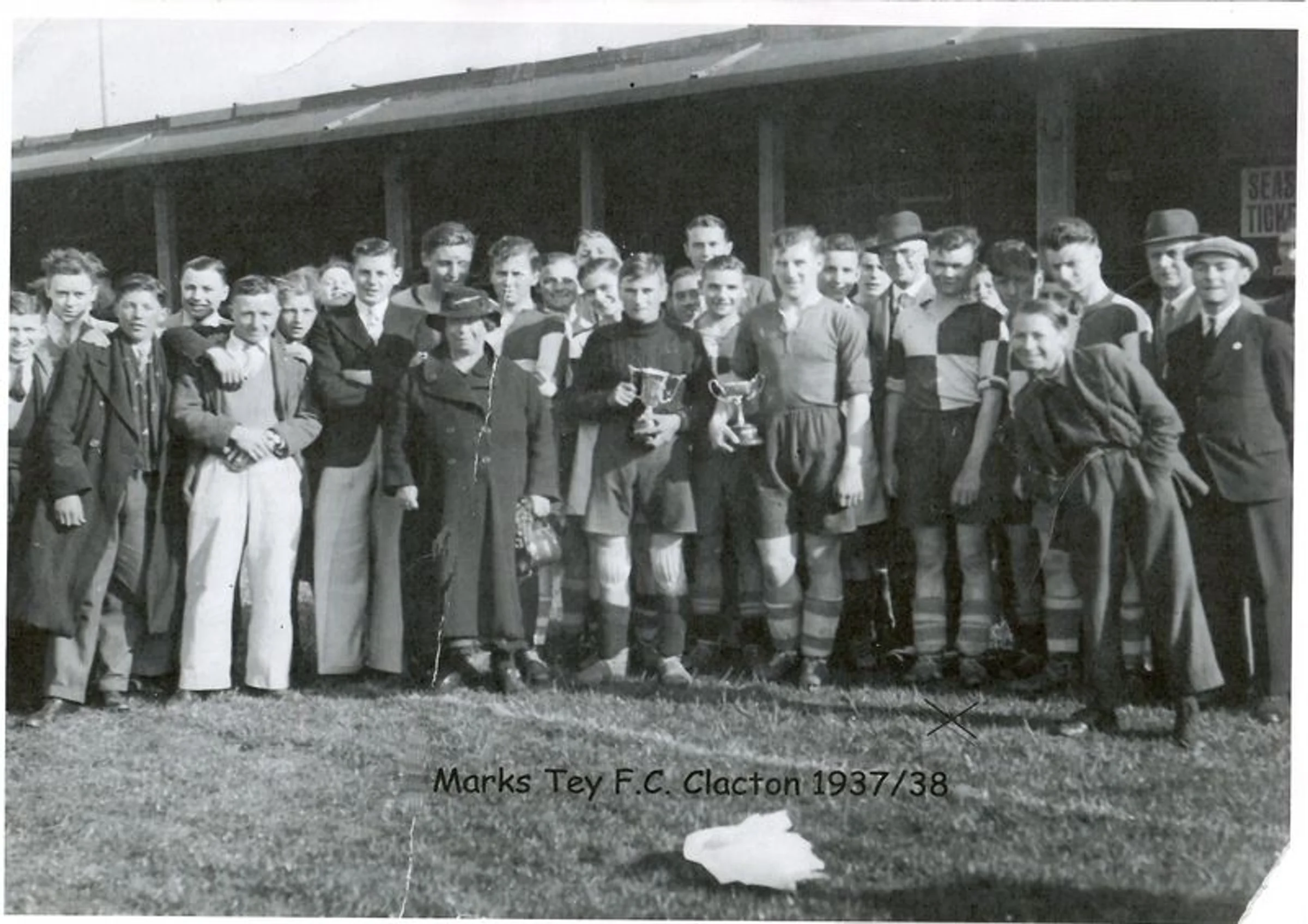 Football Cup Winners, with a label as Marks Tey F.C. Clacton 1937-38. Two players are holding silver cups and they are surrounded by a small crowd of players and supporters. The photo must have been taken at the football ground in Clacton.