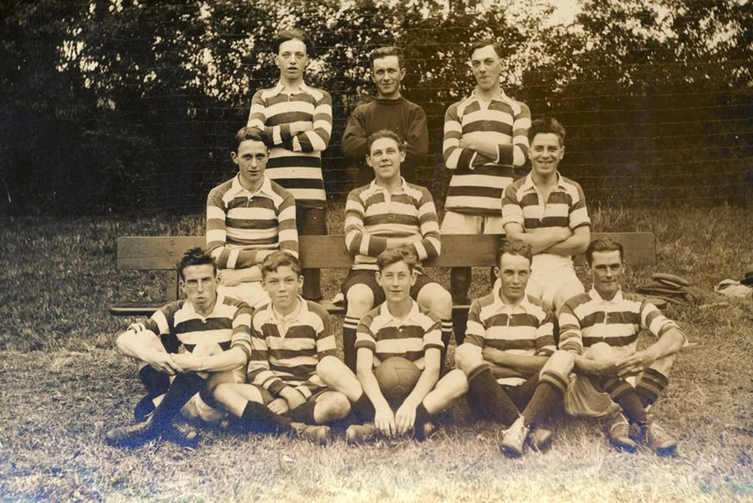Undated photo of eleven men, ten of them wearing horizontal striped shirts.