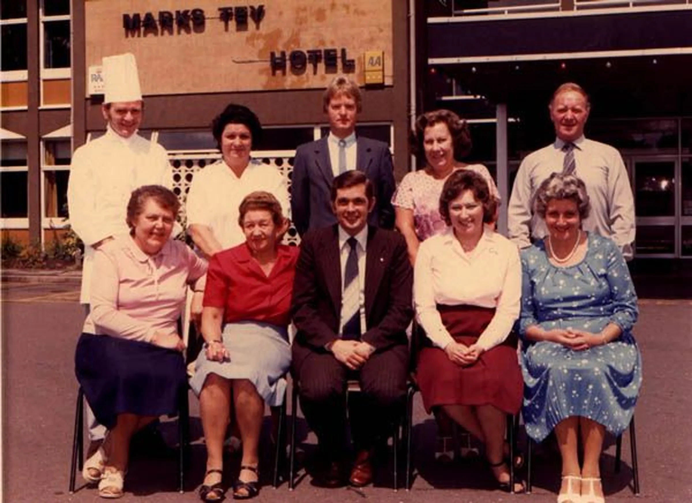 Ten members of the staff at Marks Tey Hotel, seated or standing at a bench in front of the hotel in 1982.