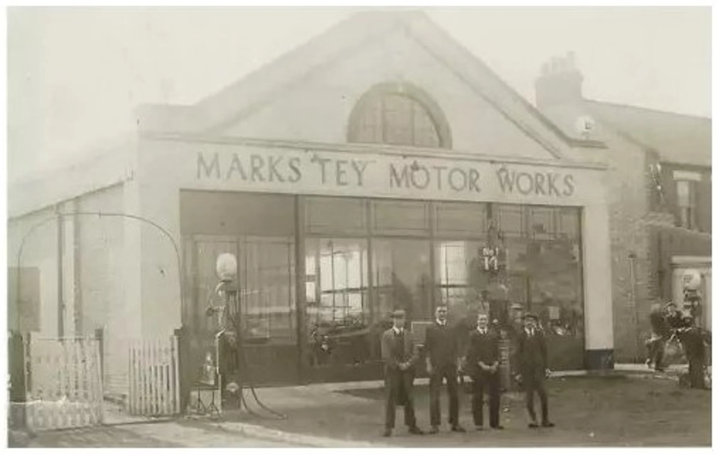 Undated photo of Marks Tey Motor Works with four men standing outside.
