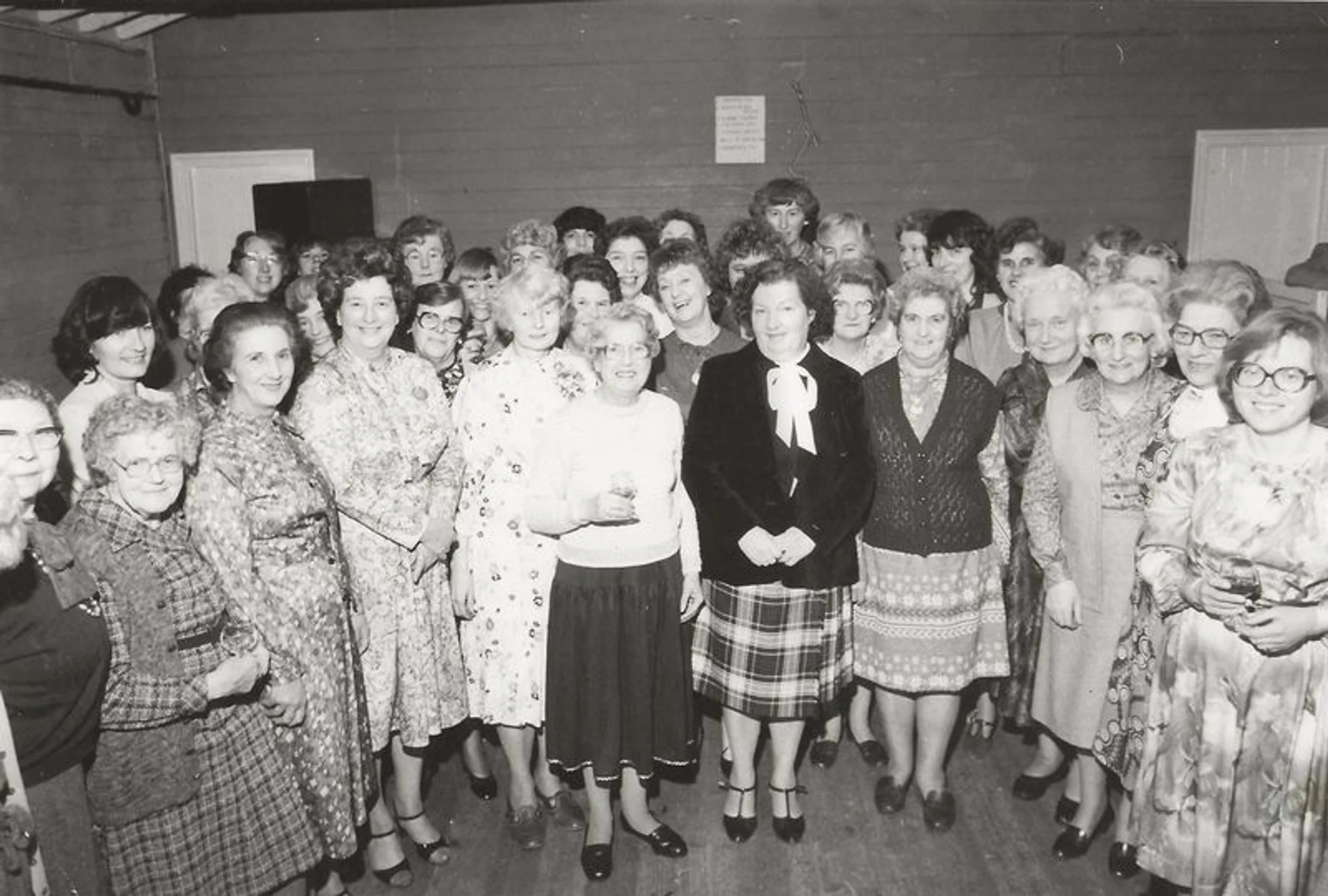 A black & white photo of a group of Women's Institute members taken on 10 Feb 1981 for the Essex County Standard newspaper. There is a matching chart identifying the names of the ladies. It was the party to celebrate the Golden Anniversary of Marks Tey WI.