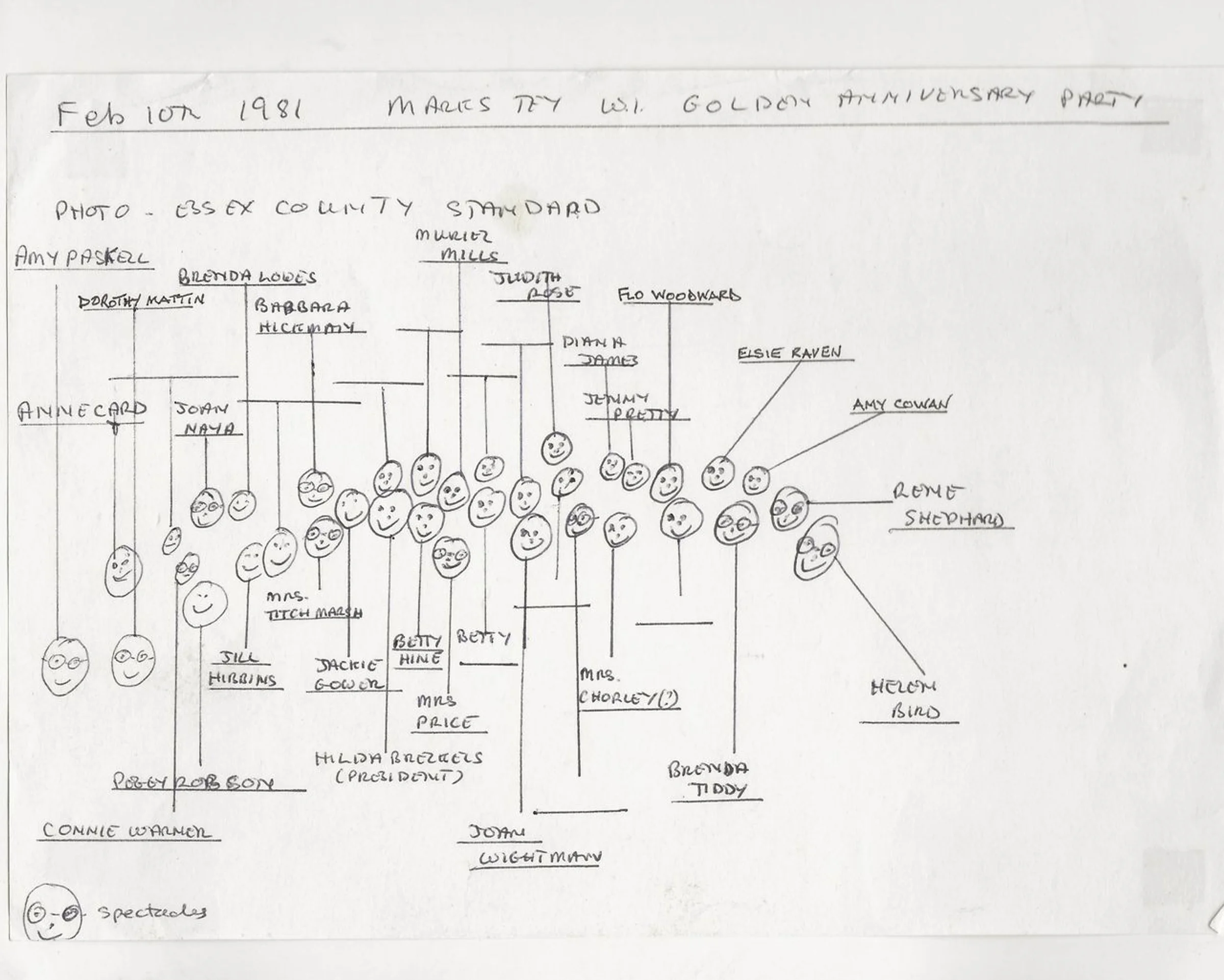 There is a black & white photo of a group of Women's Institute members taken on 10 Feb 1981 for the Essex County Standard newspaper. This is the matching chart identifying the names of the ladies. It was the party to celebrate the Golden Anniversary of Marks Tey WI. The names are given in the transcript.