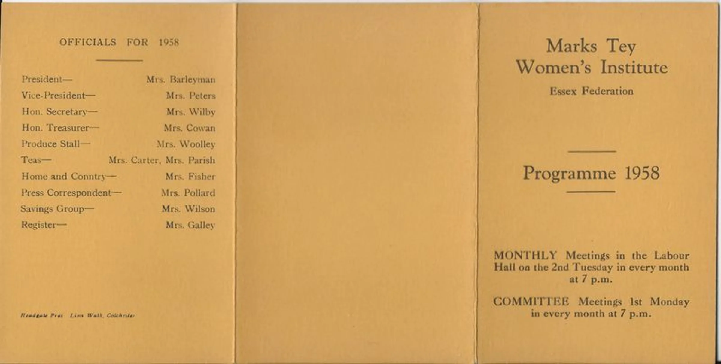 The card gives the subject of the events at the monthly meetings in the Labour Hall, who is on the tea rota and a list of officials for that year.