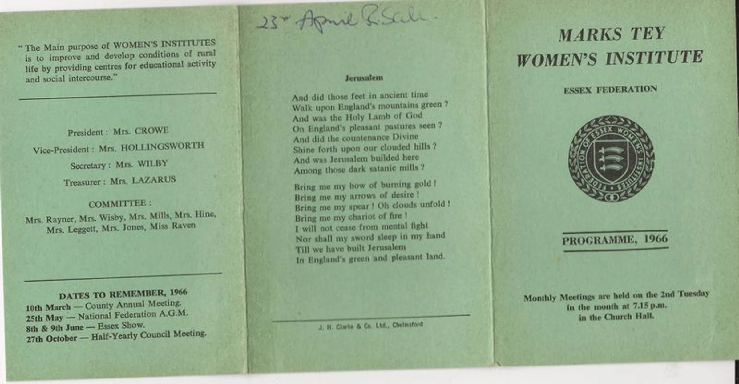 This printed card gives the subject of the events at the monthly meetings on the 2nd Tuesday and a list of officials for that year. The words for the hymn Jerusalem are included.