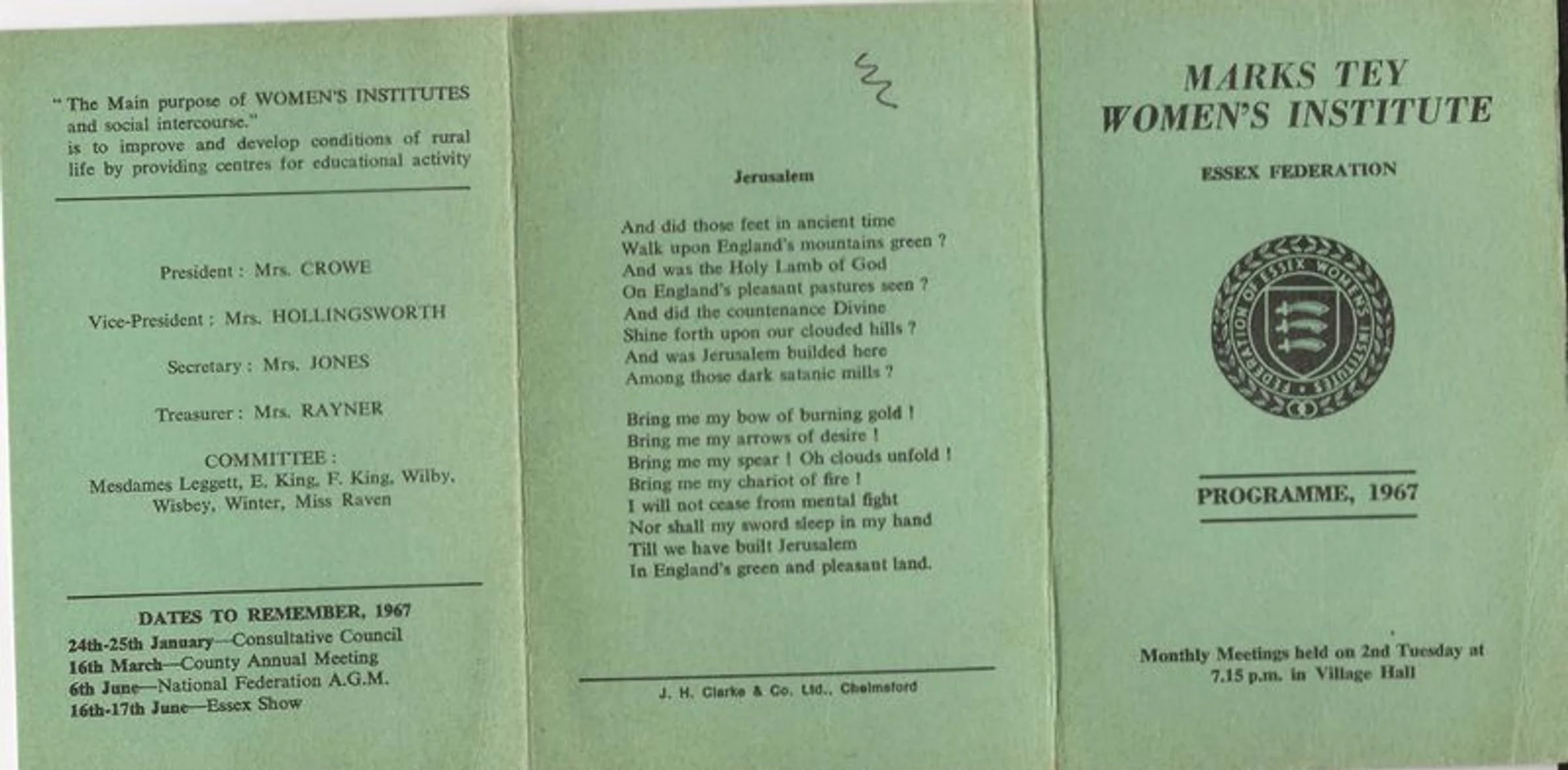 This printed card gives the subject of the events at the monthly meetings in the Village Hall on the 2nd Tuesday and a list of officials for that year. The words for the hymn Jerusalem are included.