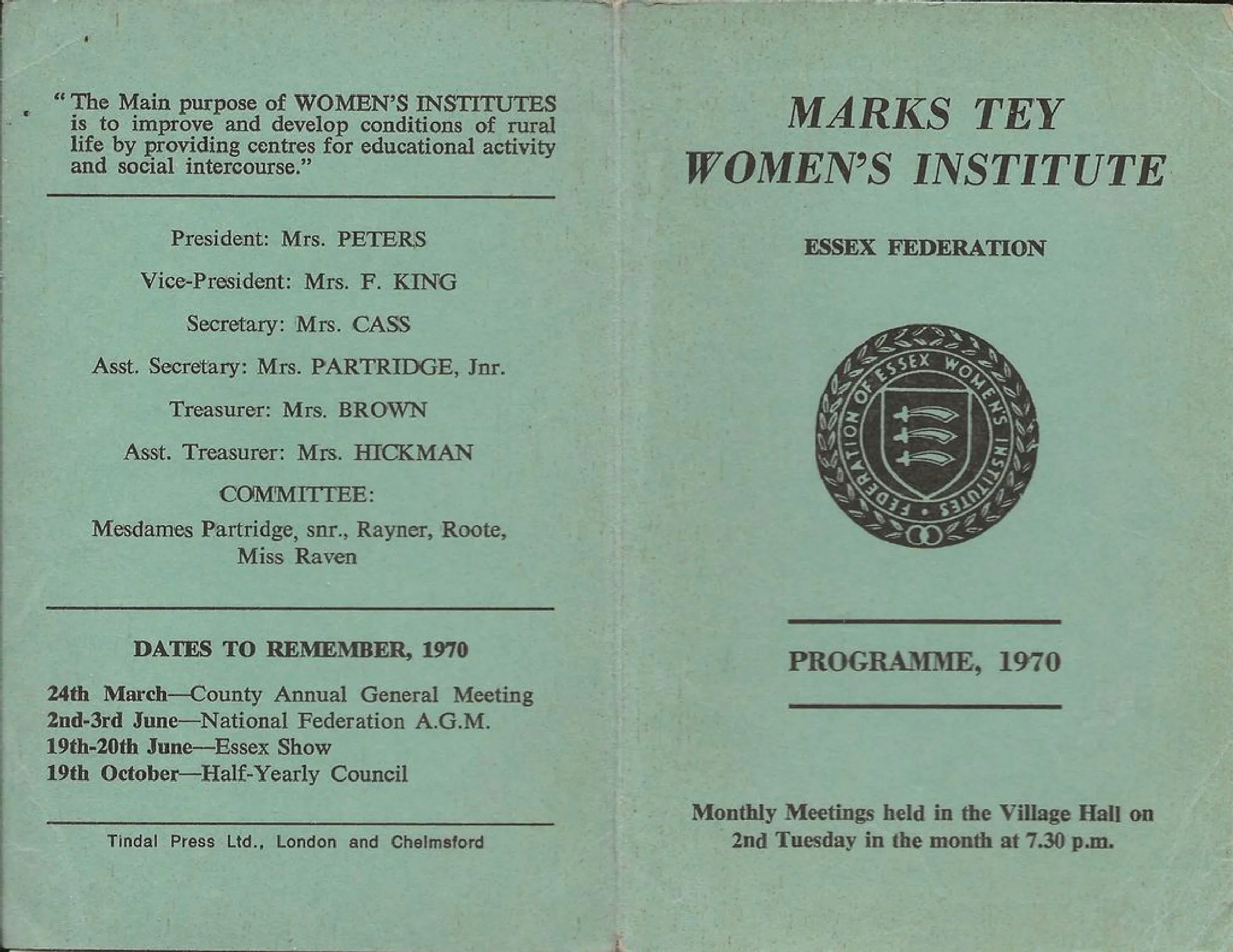 This printed card gives the subject of the events at the monthly meetings in the Village Hall on the 2nd Tuesday, the Hostesses (who is on the tea rota) and a list of officials for that year. The words for the hymn Jerusalem are included.