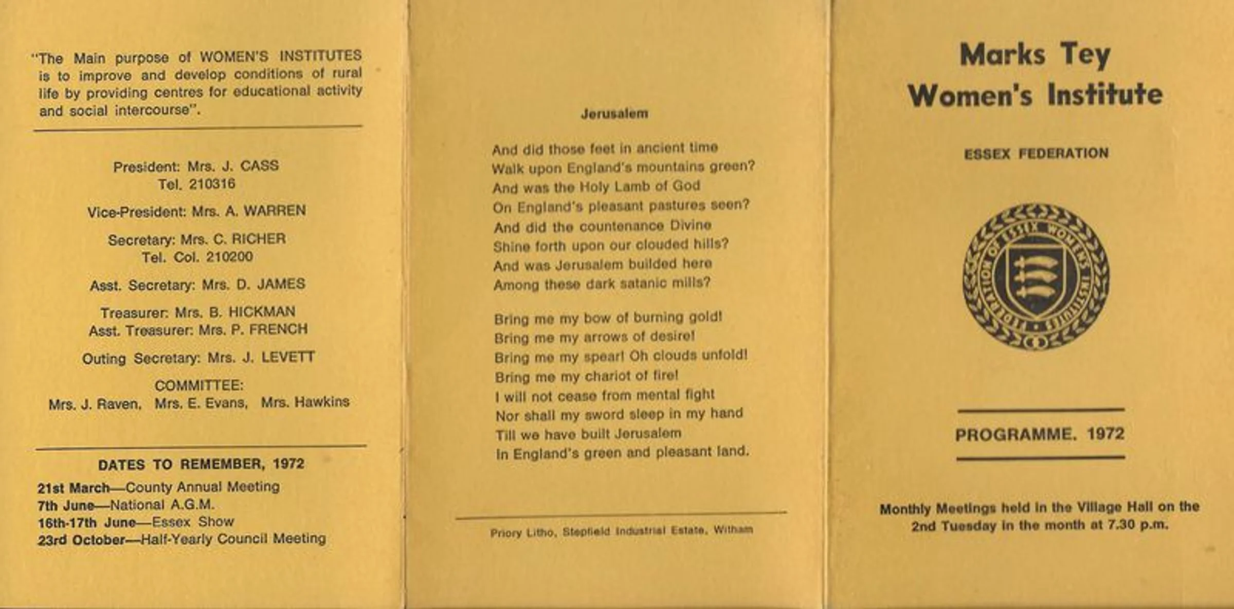 This printed card gives the subject of the events at the monthly meetings in the Village Hall on the 2nd Tuesday, the Hostesses (who is on the tea rota) and a list of officials for that year. The words for the hymn Jerusalem are included.