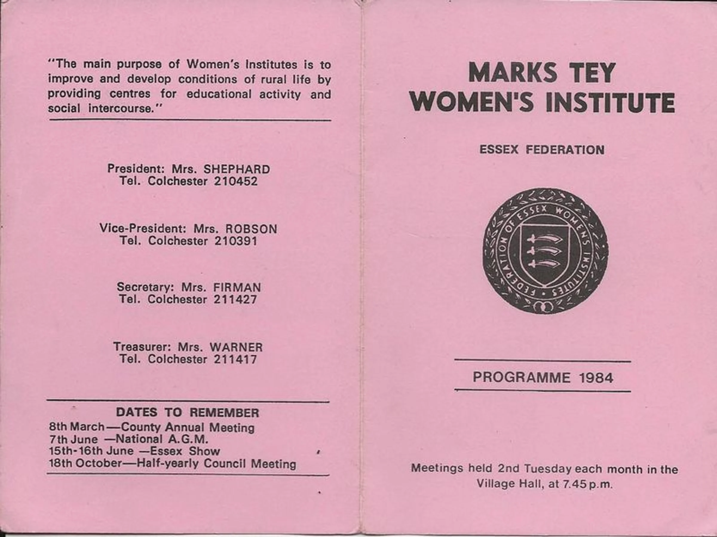This printed card gives the subject of the events at the monthly meetings in the Village Hall on the 2nd Tuesday and a list of officials for that year.