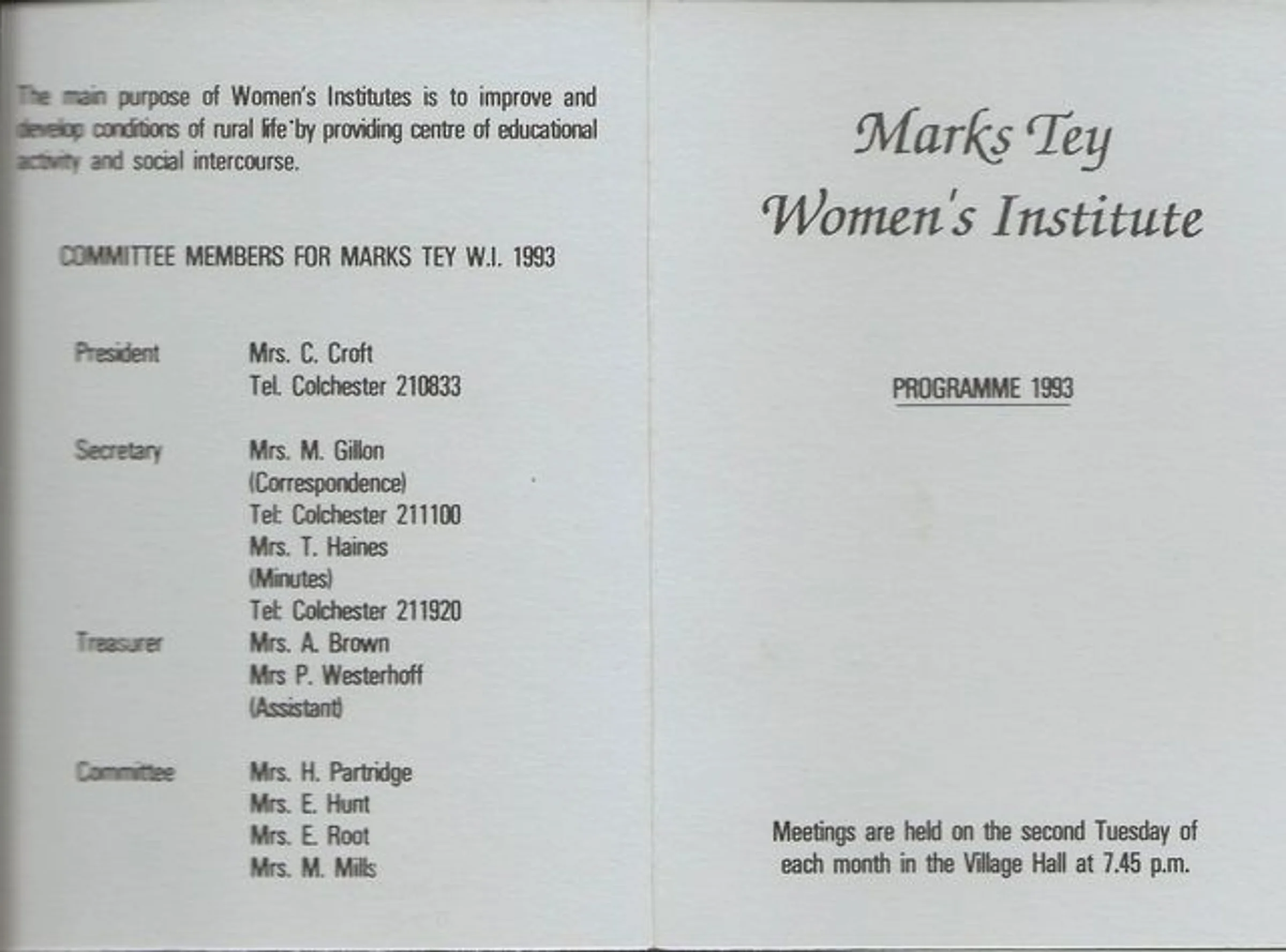 This printed card gives the subject of the events at the monthly meetings in the Village Hall on the 2nd Tuesday and a list of officials for that year.
