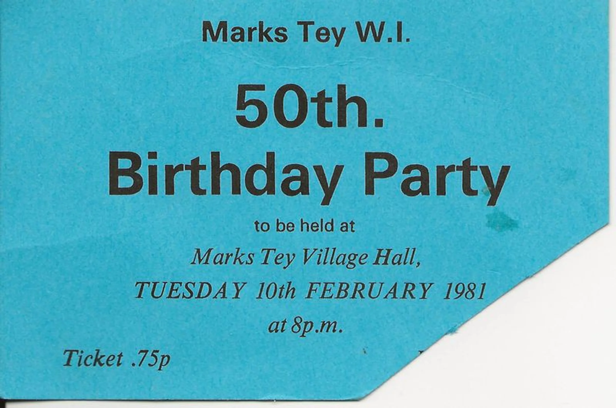A blue ticket for the WI 50th Birthday Party to be held at Marks Tey Village Hall on Tuesday, 10 February 1981 at 8pm. Ticket 75p.