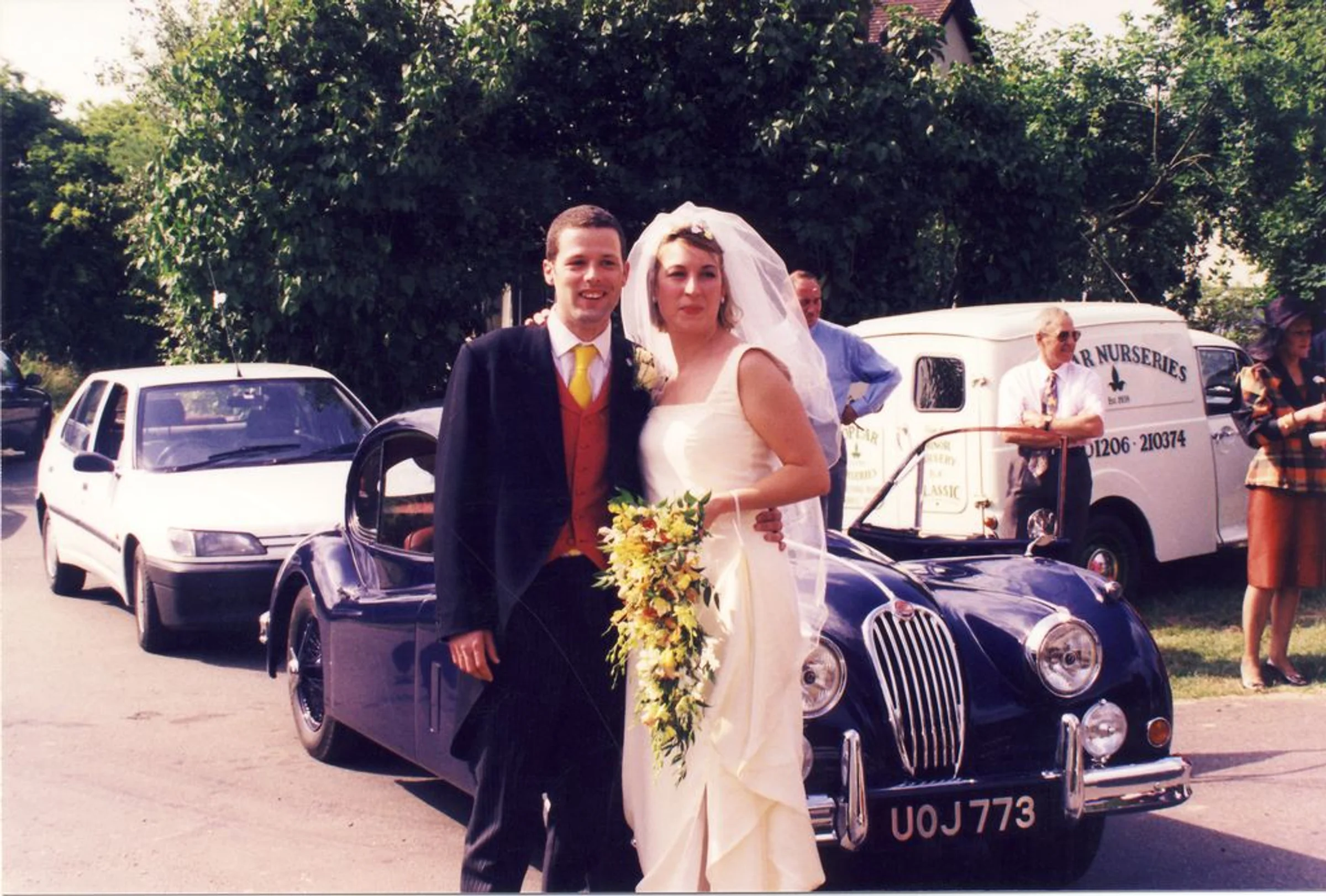 A photo of Matthew Cowan and his bride on their wedding day. It appears to have been taken at Poplar Nurseries. Undated.