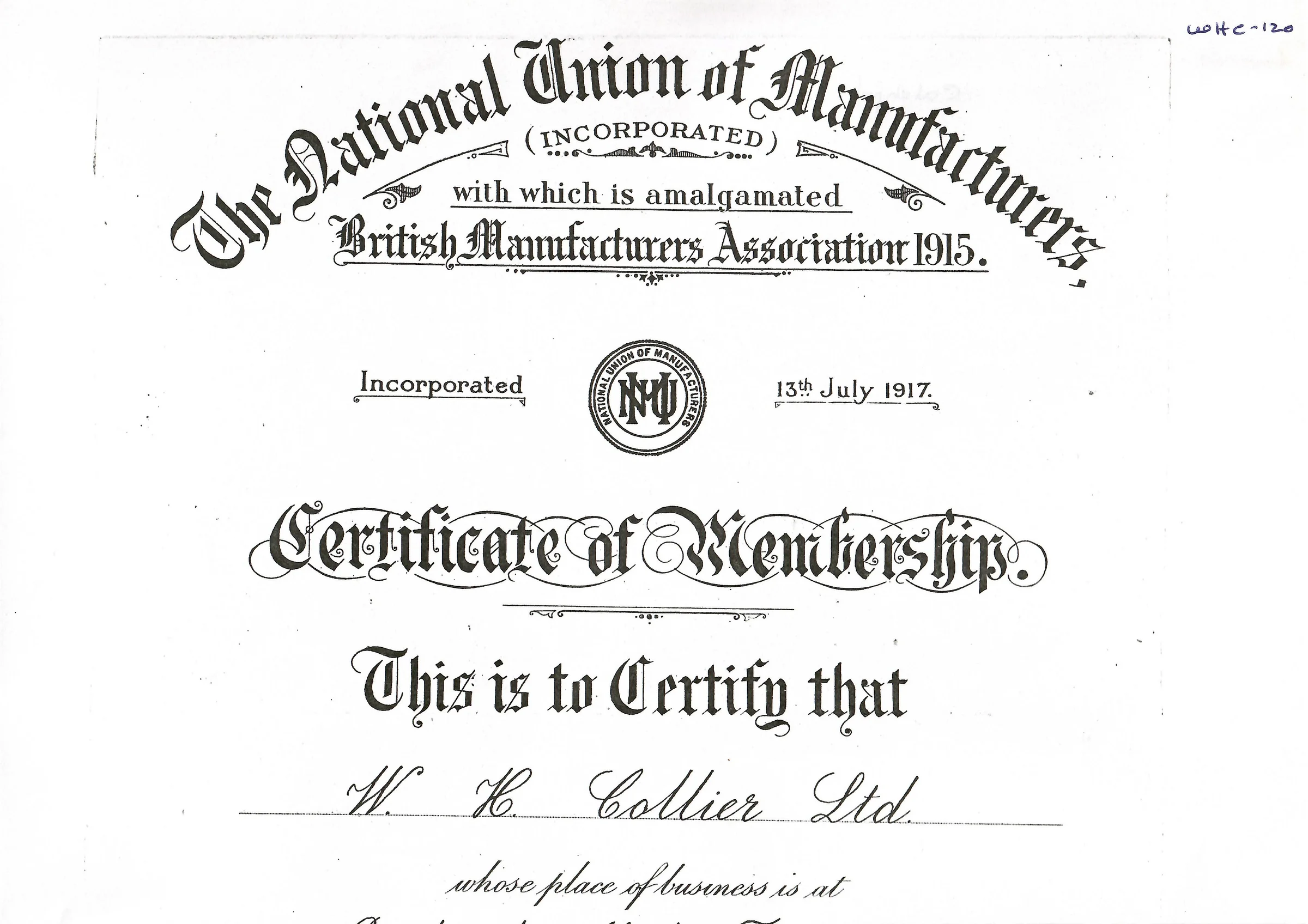 W H Collier ltd. membership card for the National Union of Manufacturers.