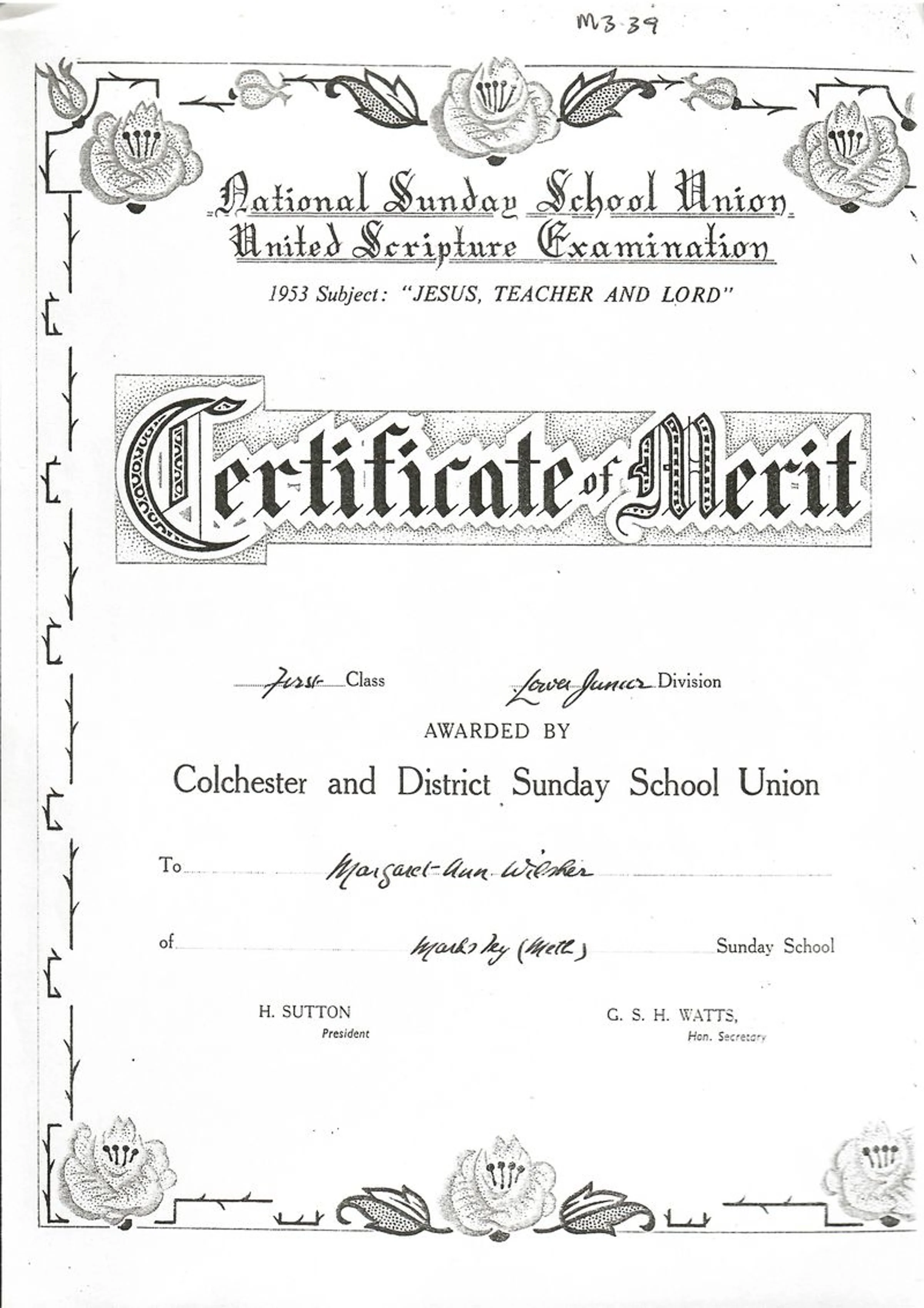 Certificate of Merit awarded to Margaret Ann Wilsher in 1953 on the subject, Jesus, Teacher and Lord.