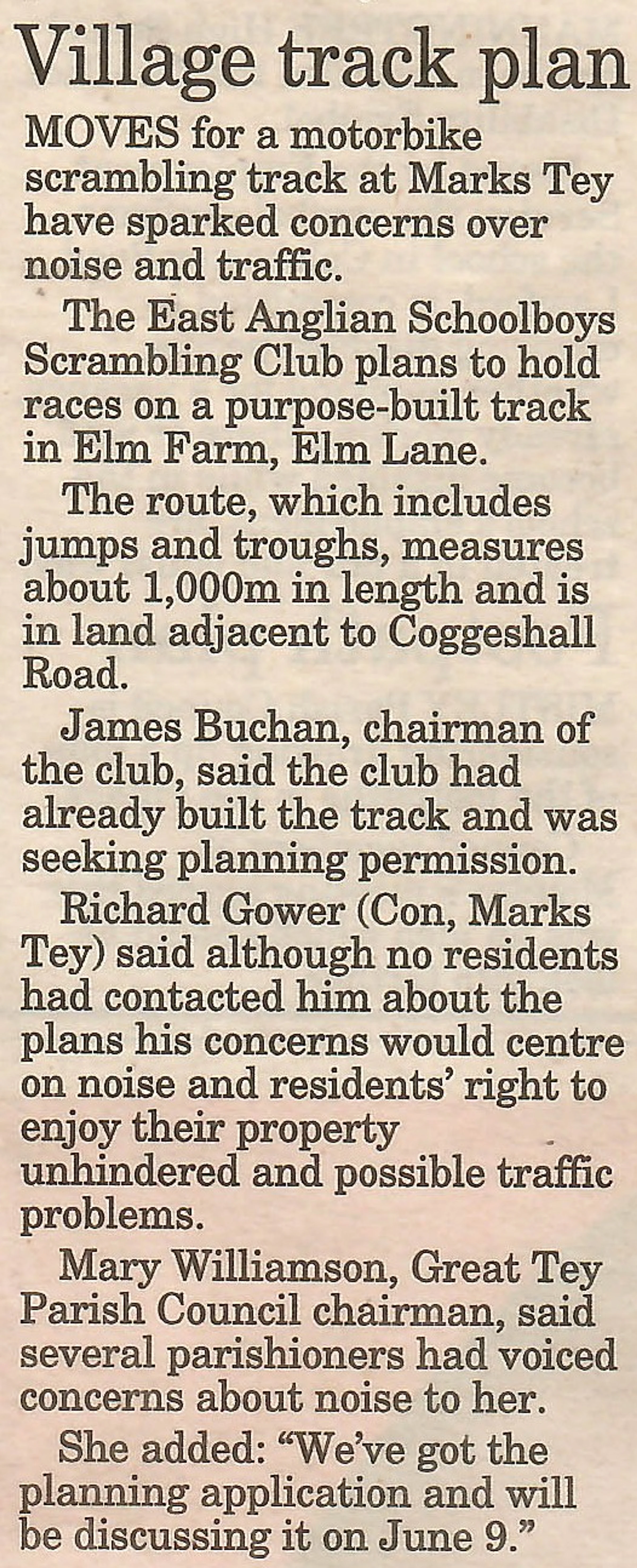 Newspaper report regarding a proposed motorbike race track.