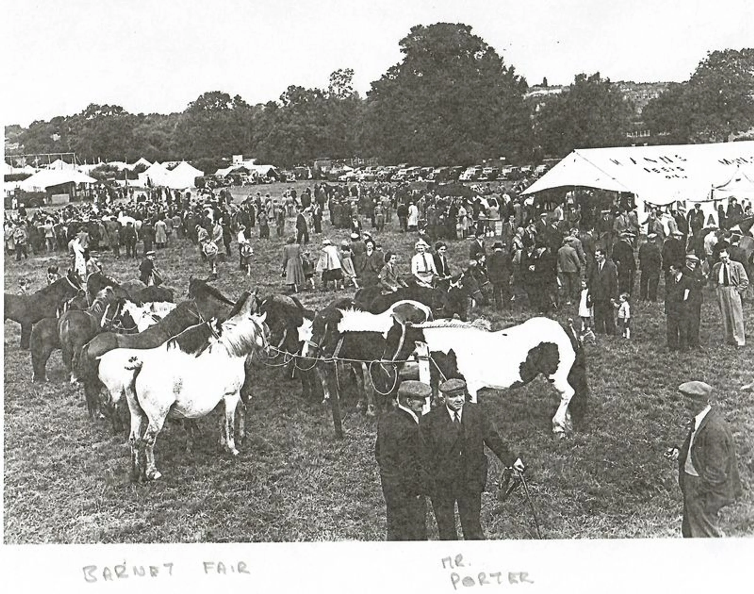 There are two men standing together at the front of this photo taken at Barnet Fair. Mr Dick Porter is the man on the right with an interest in the horses. The photo is undated.
