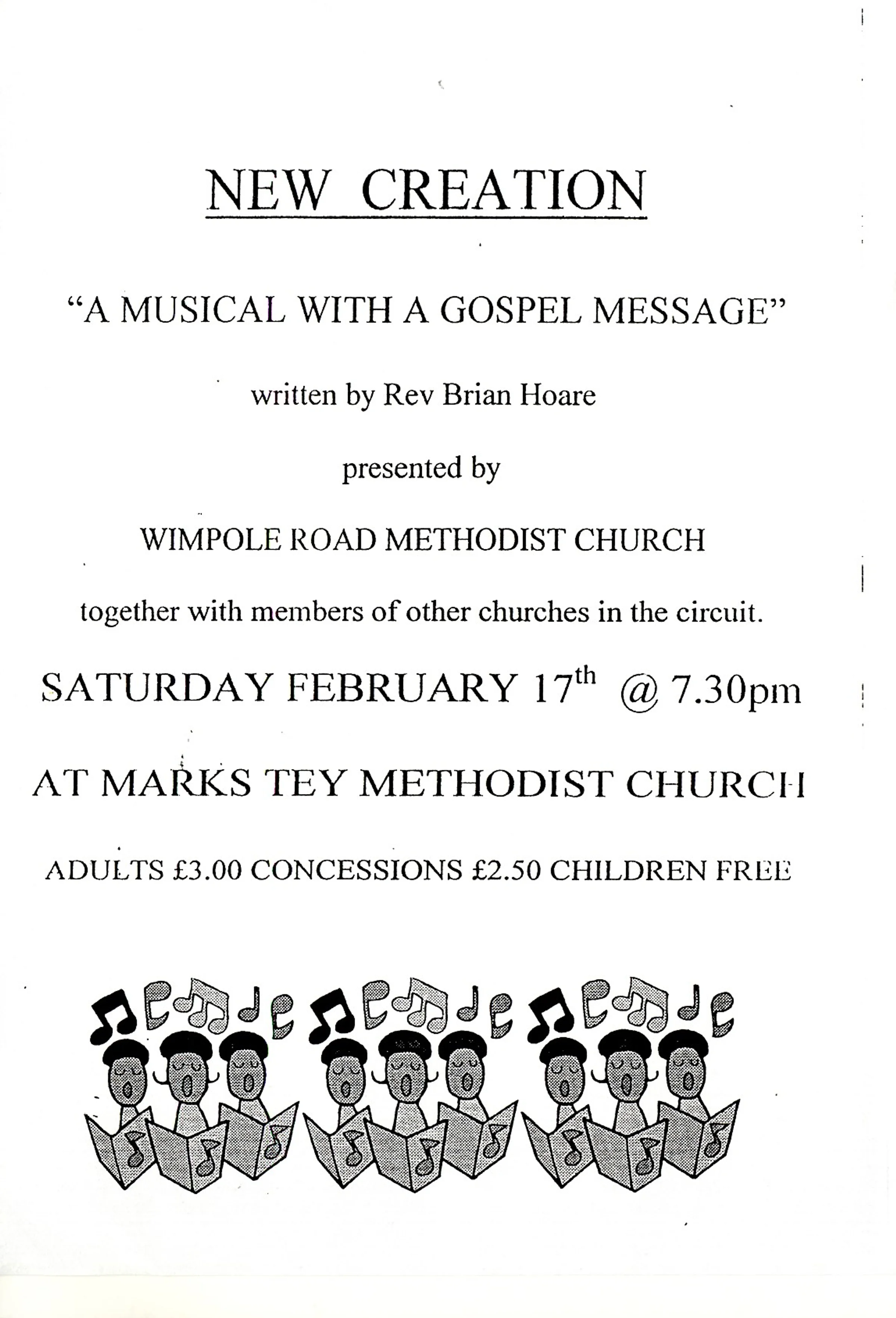 On Saturday, 17 February New Creation, a musical with a Gospel message, was presented at the Methodist Church, presented by Wimpole Road Methodist Church.