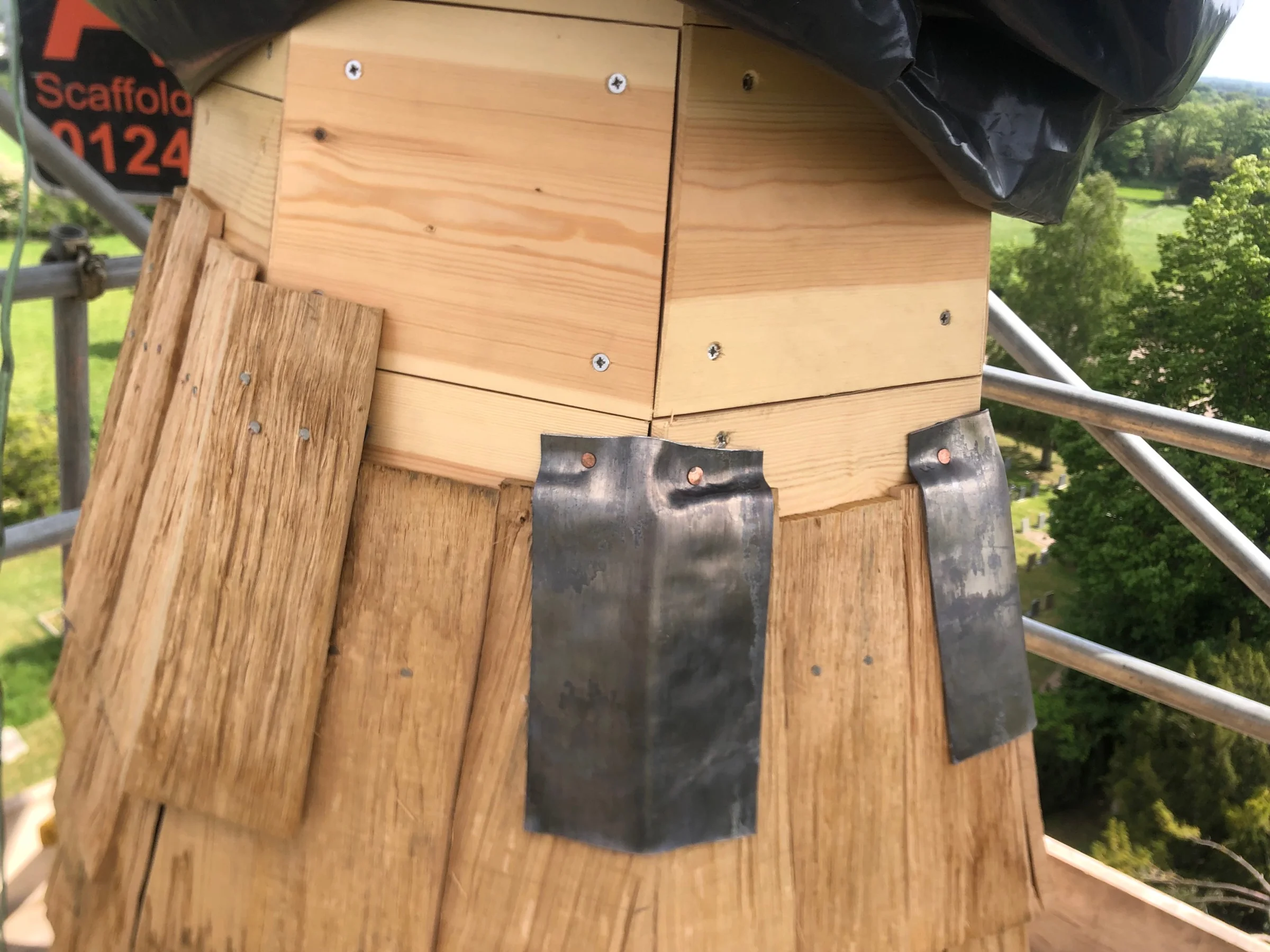 St Andrews Church Spire restoration, new oak shakes being fitted to the Spires