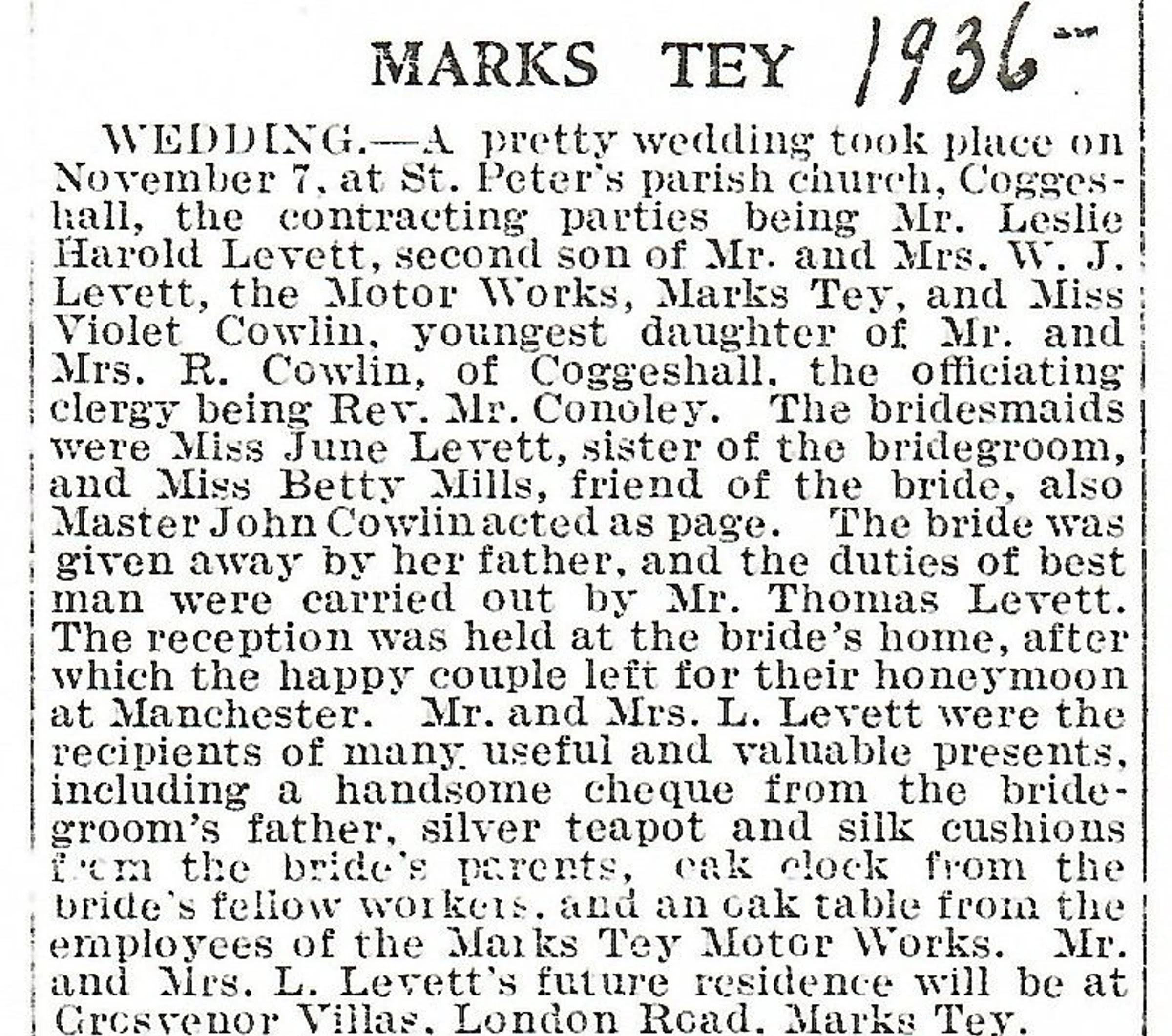 Newspaper report on the wedding of Leslie Levett and Violet Cowling.