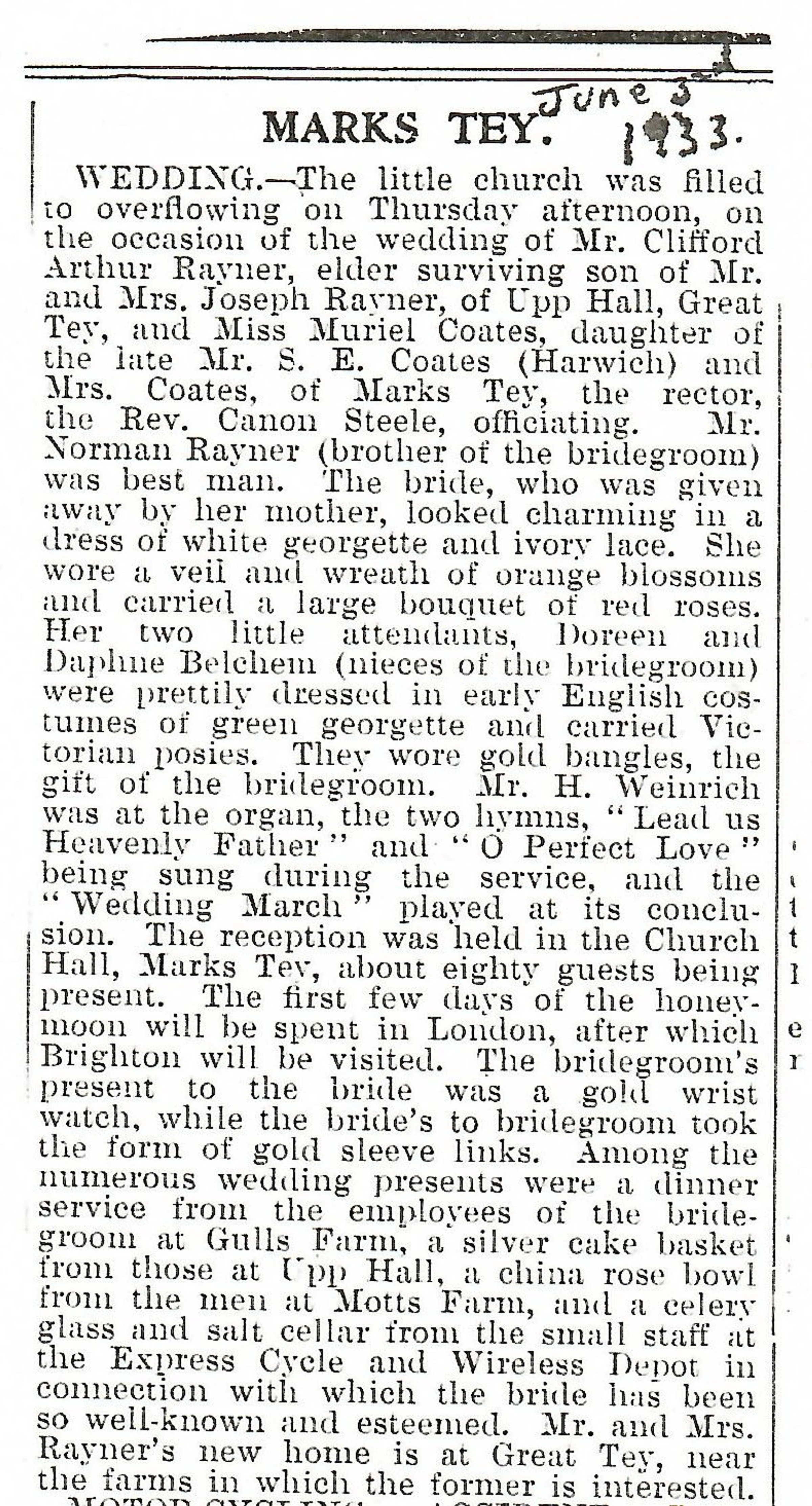 Newspaper report regarding the wedding of Clifford Rayner and Muriel Coates at St Andrew's Church.