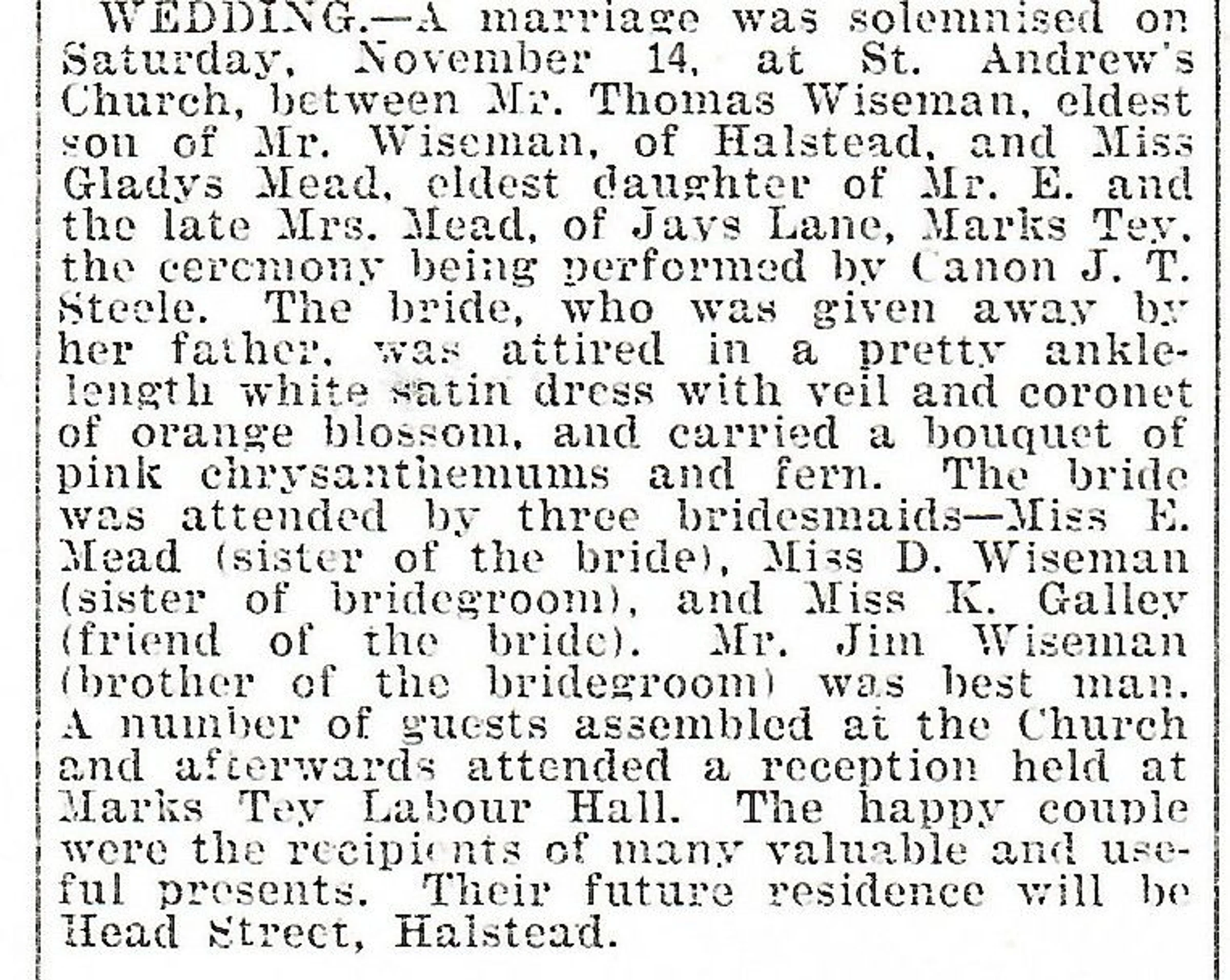 Newspaper report regarding the marriage of Thomas Wiseman and Gladys Mead.