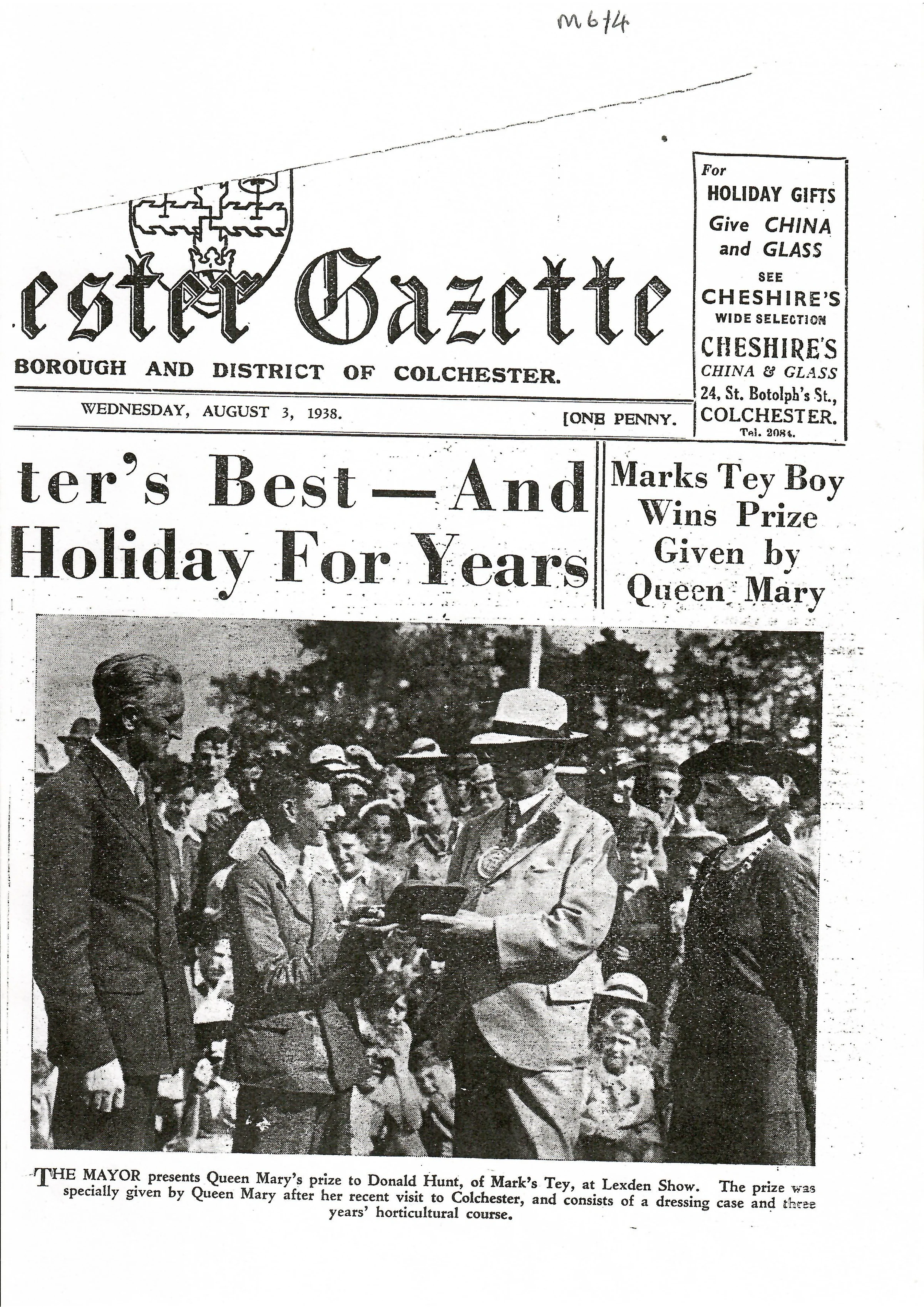 Photograph reporting on the visit of Queen Mary to the Lexden Show.