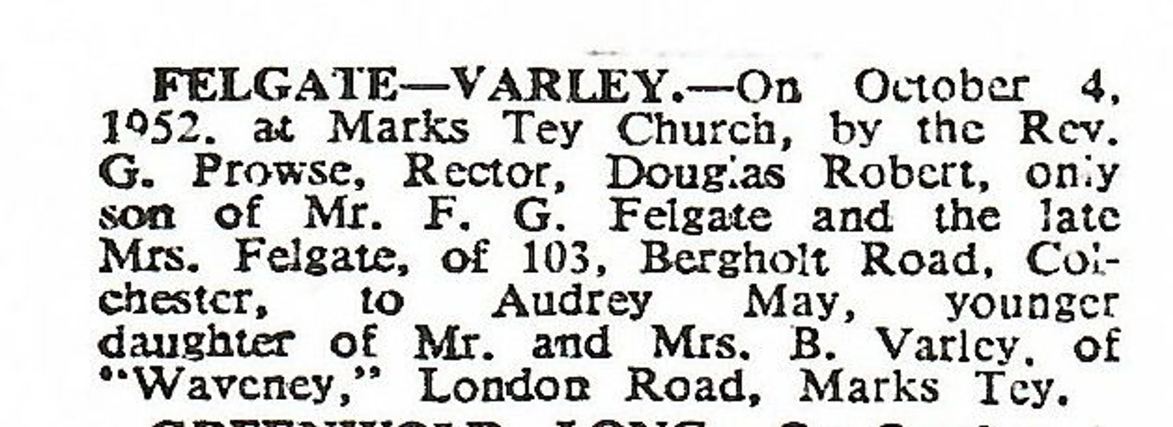Newspaper notice of the marriage between Douglas Felgate and Audrey Varley.