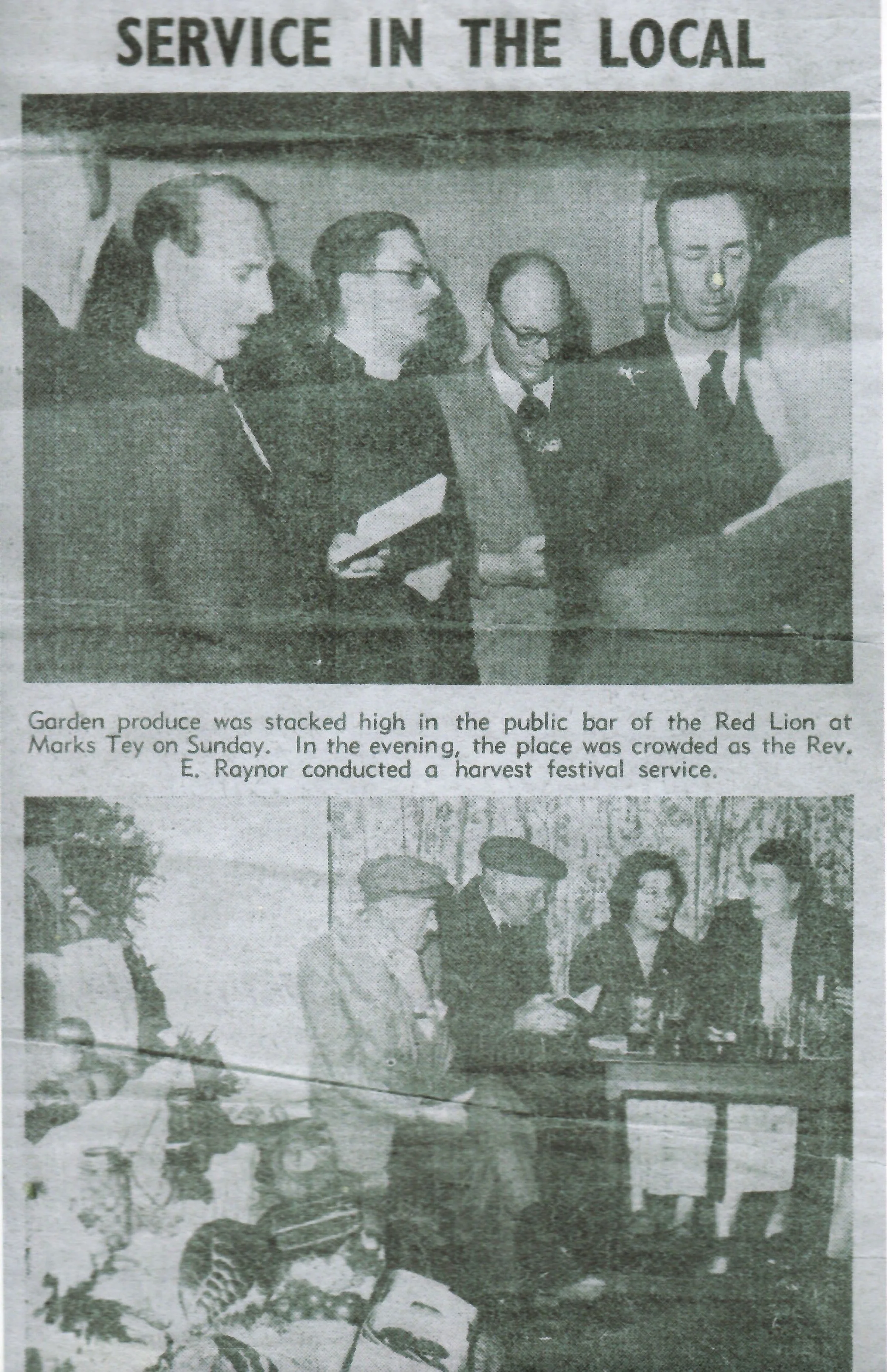 Newspaper photographs and report on harvest festival in the Red Lion.