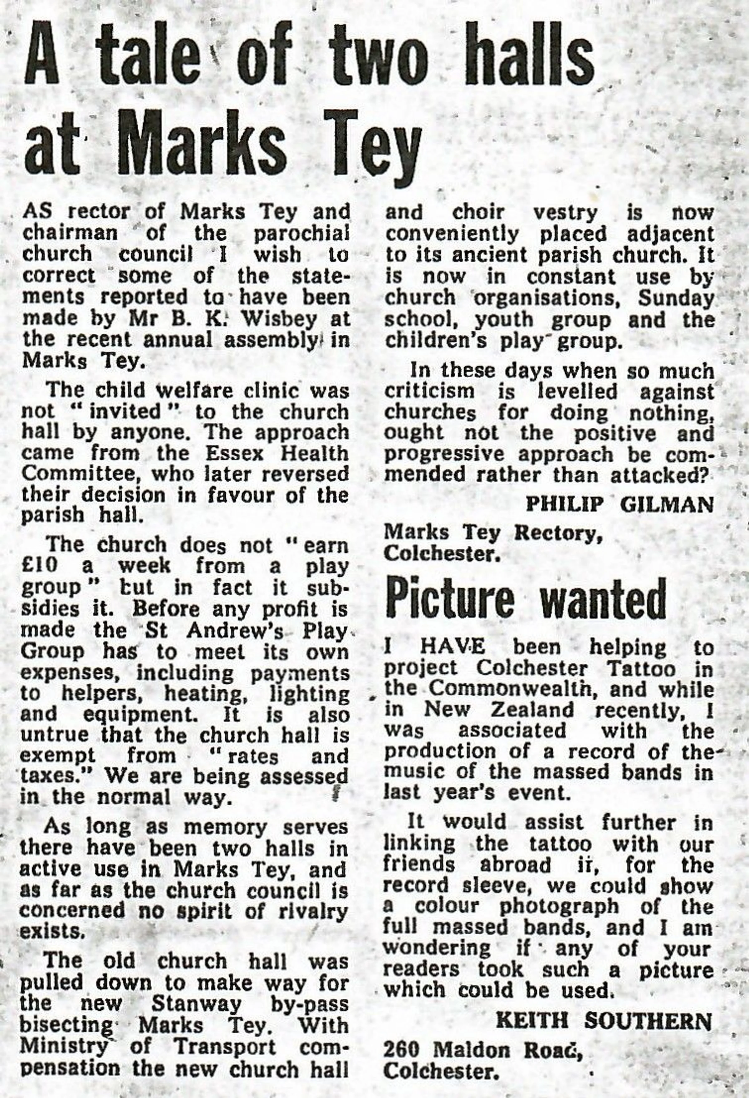 Published letter from Rev Philip Gilman regarding the church hall.
