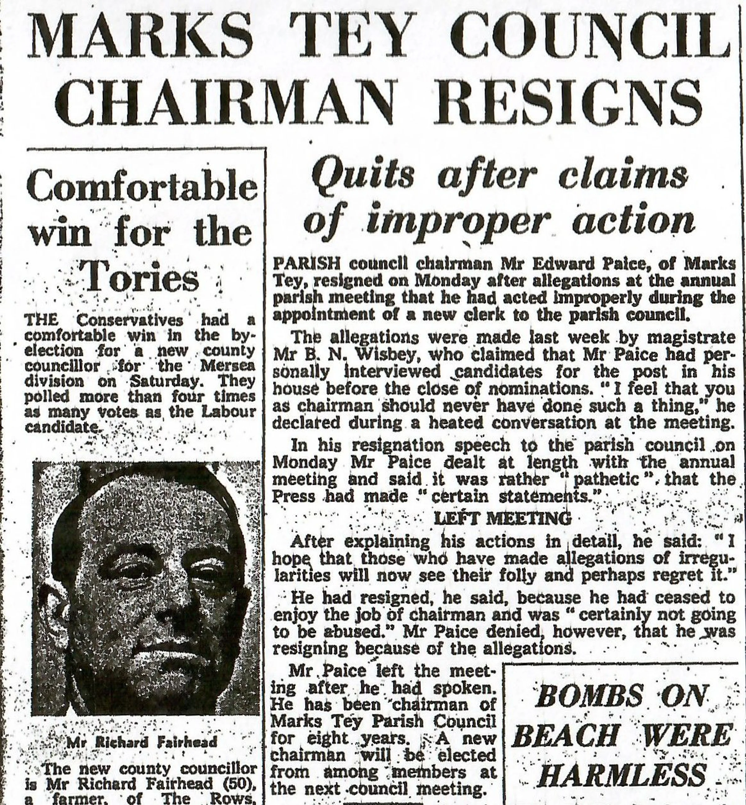 Article reporting on the resignation of Mr Edward Paice from the Parish Council.