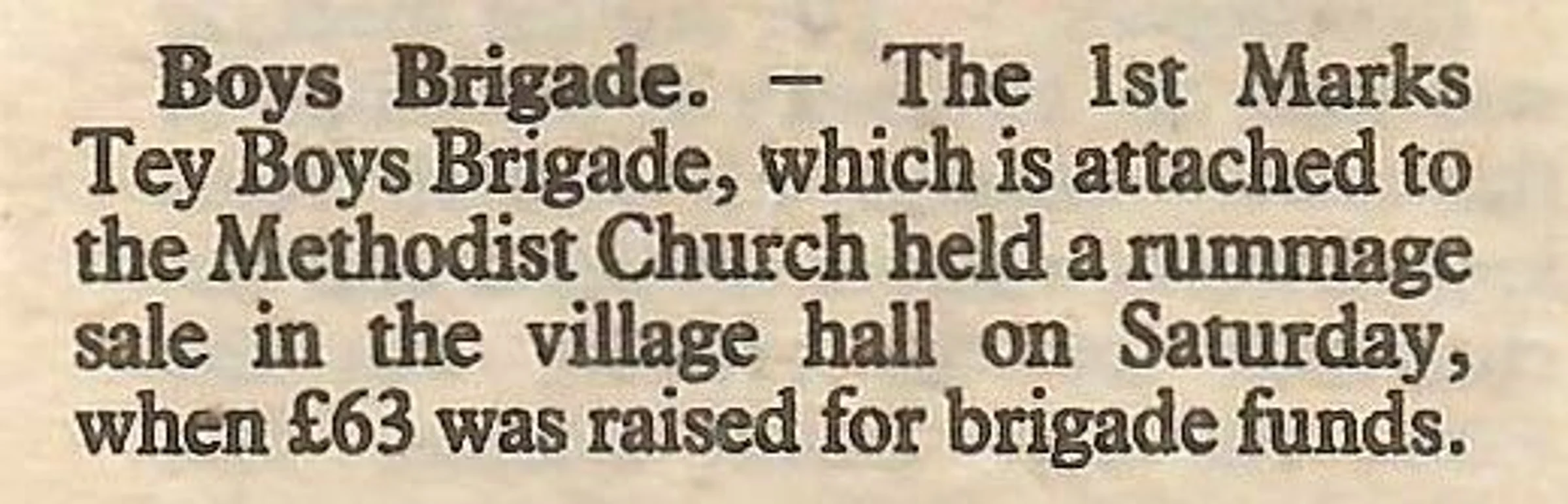 Village news column regarding the Boys Brigade rummage sale.