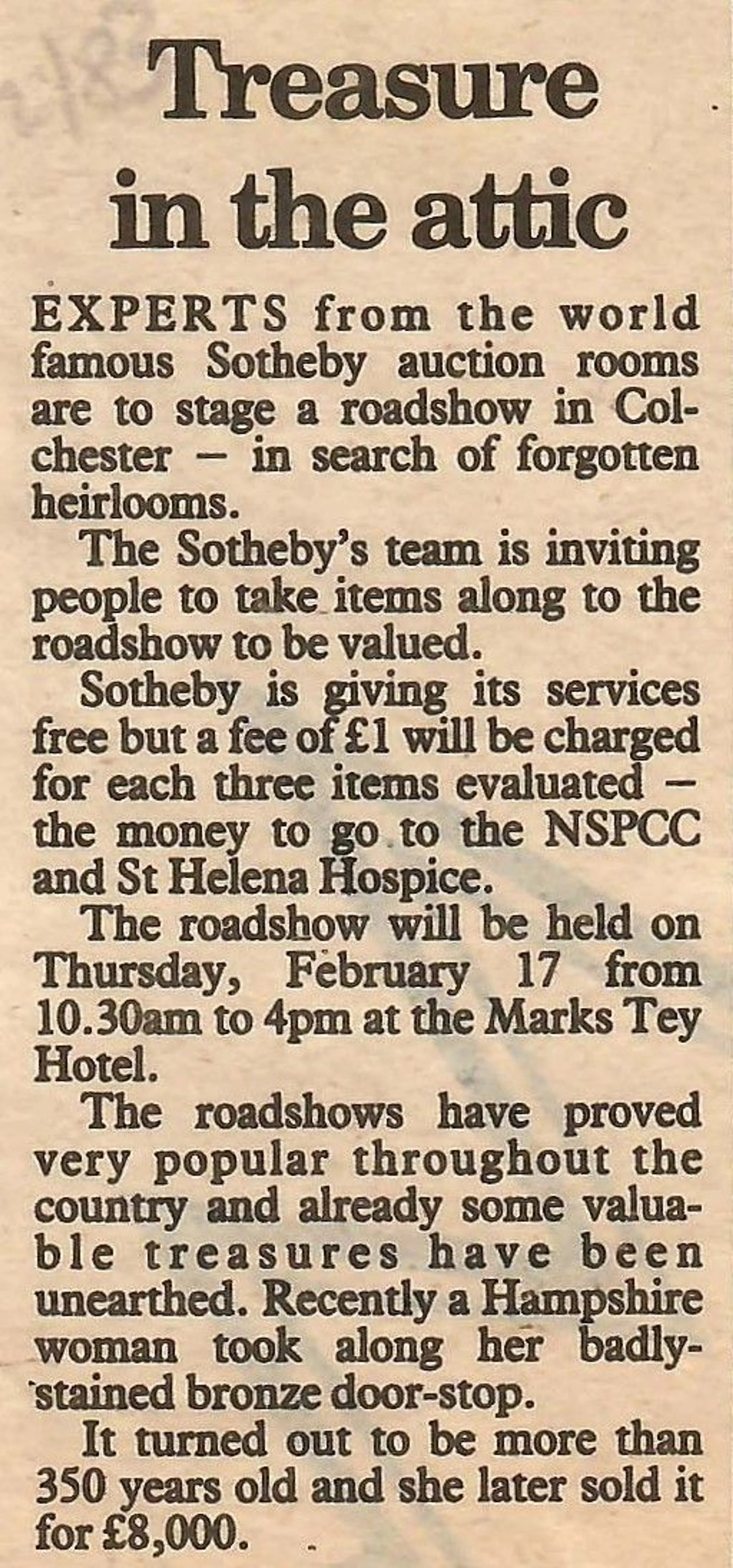 Newspaper report on a Sotherby roadshow at the Marks Tey Hotel.