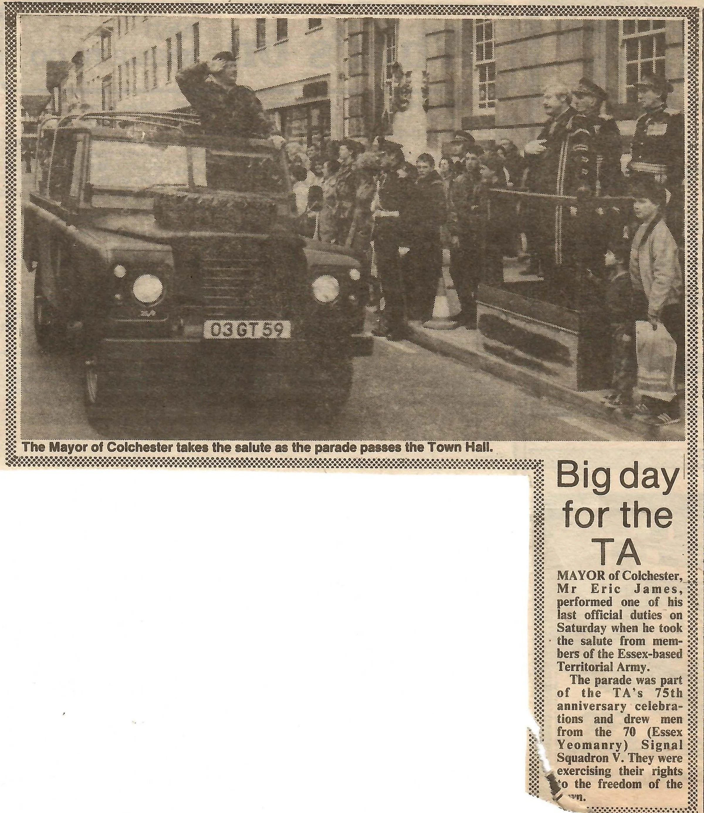 Newspaper photograph and article regarding the TA's 75th anniversary parade in Colchester with Mayor Eric James.
