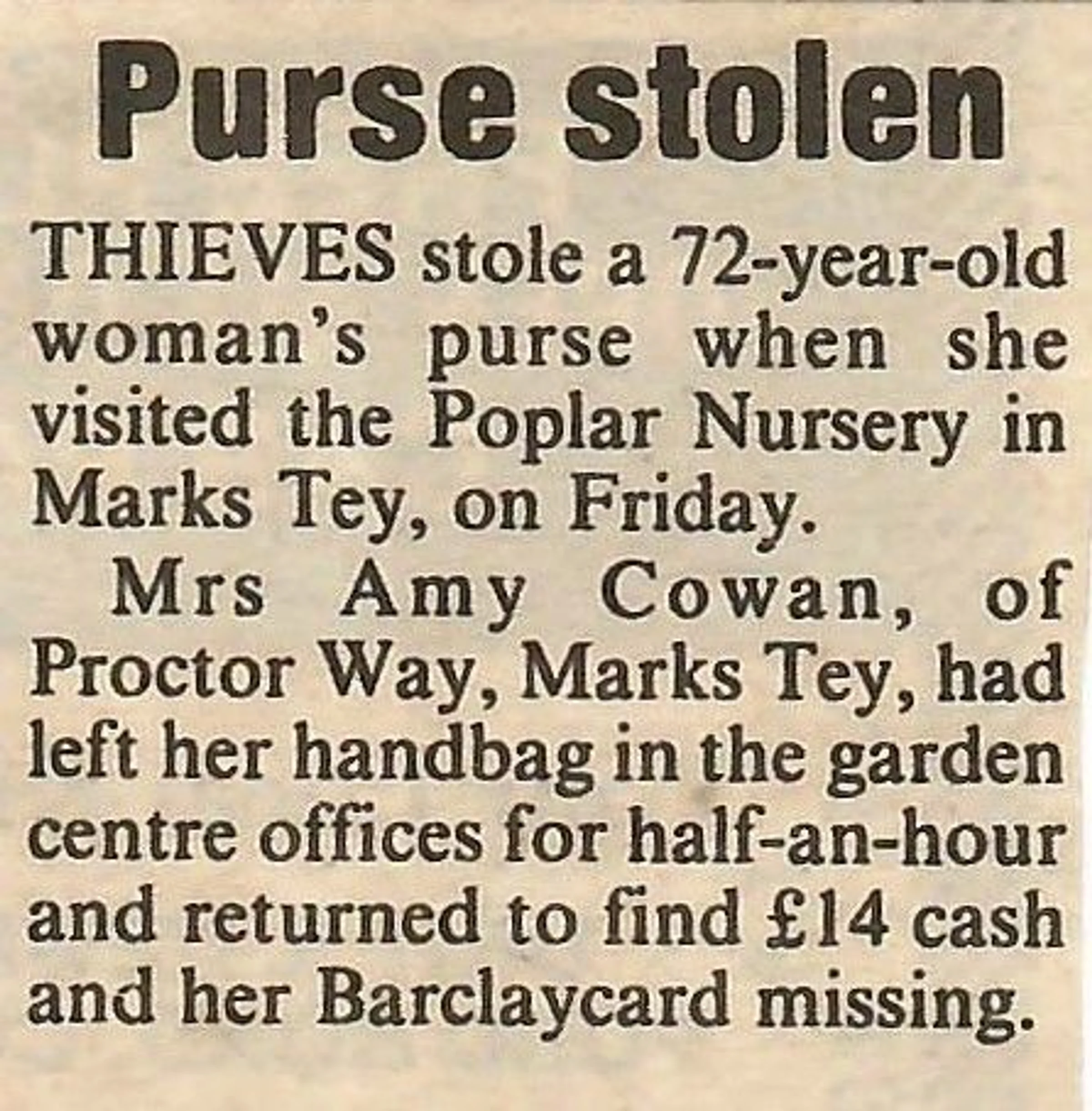 Newspaper report on the theft of a purse at Poplar Nurseries.
