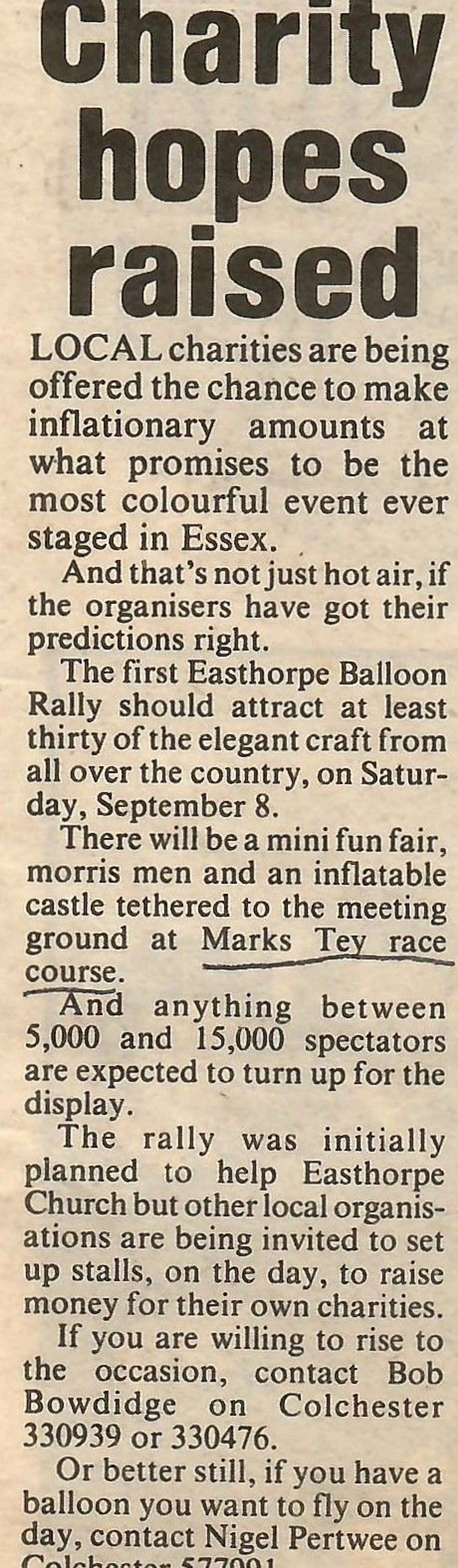 News article regarding the Easthorpe Balloon Rally at Marks Tey Racecourse.