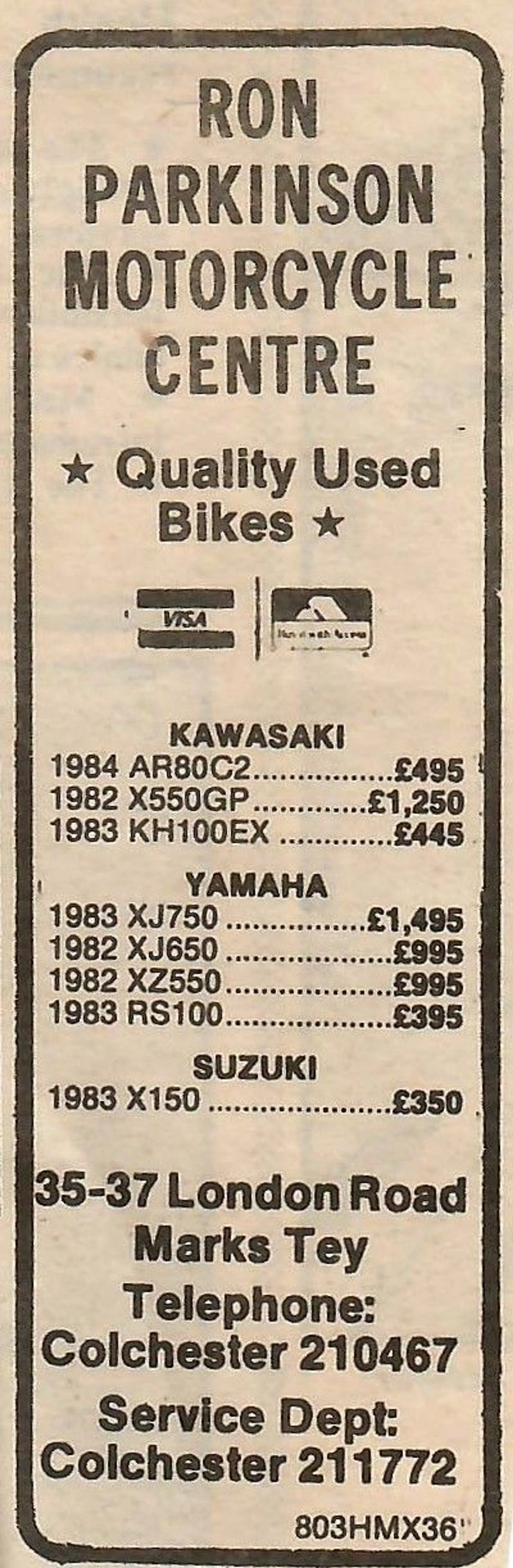 Newspaper advertisement for the Ron Parkinson Motorcycle Centre.