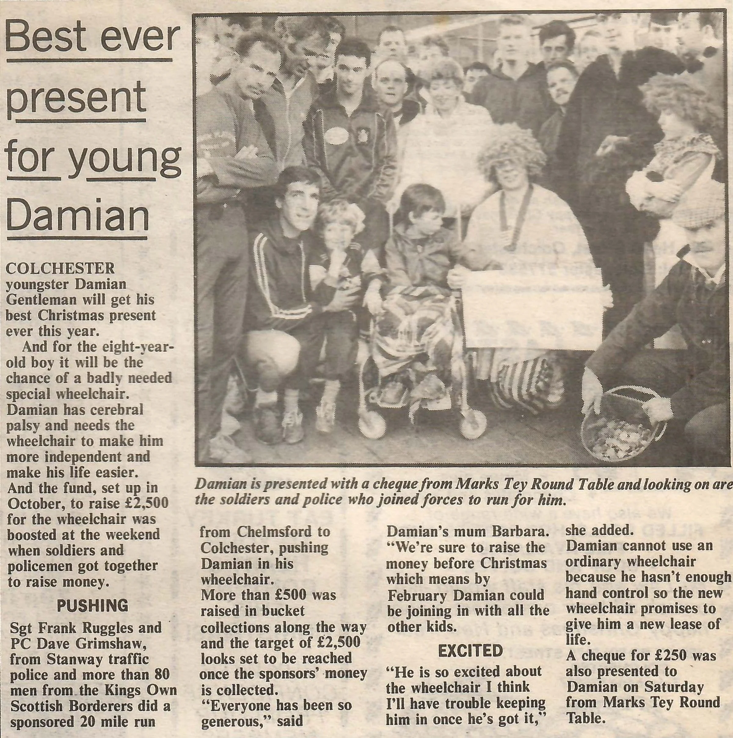 Newspaper photograph and report regarding fundraising by the Round Table and Sgt Frank Ruggles and PC Dave Grimshaw, for a wheelchair for Damian Gentleman.